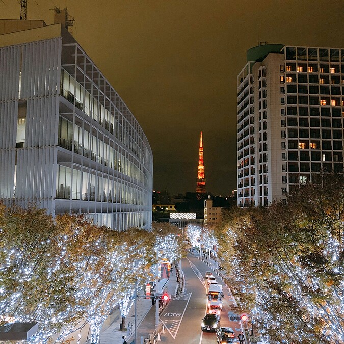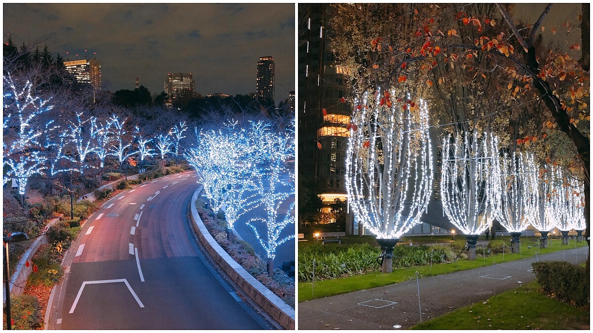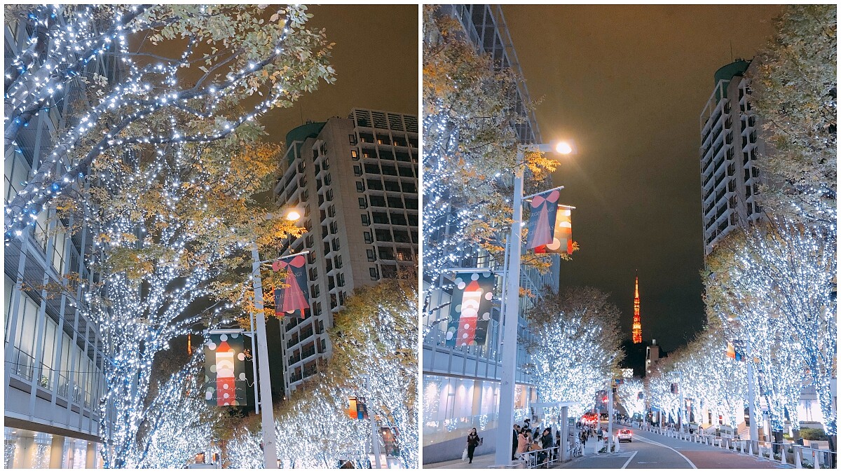 位於六本木之丘附近的「櫸坂通聖誕點燈」也頗負盛名,尤其是從六本木之丘(Roppongi Hills)走到櫸坂通時會經過一座天橋,在這裡拍攝還可以拍到東京鐵塔,兩者互相輝映更漂亮。