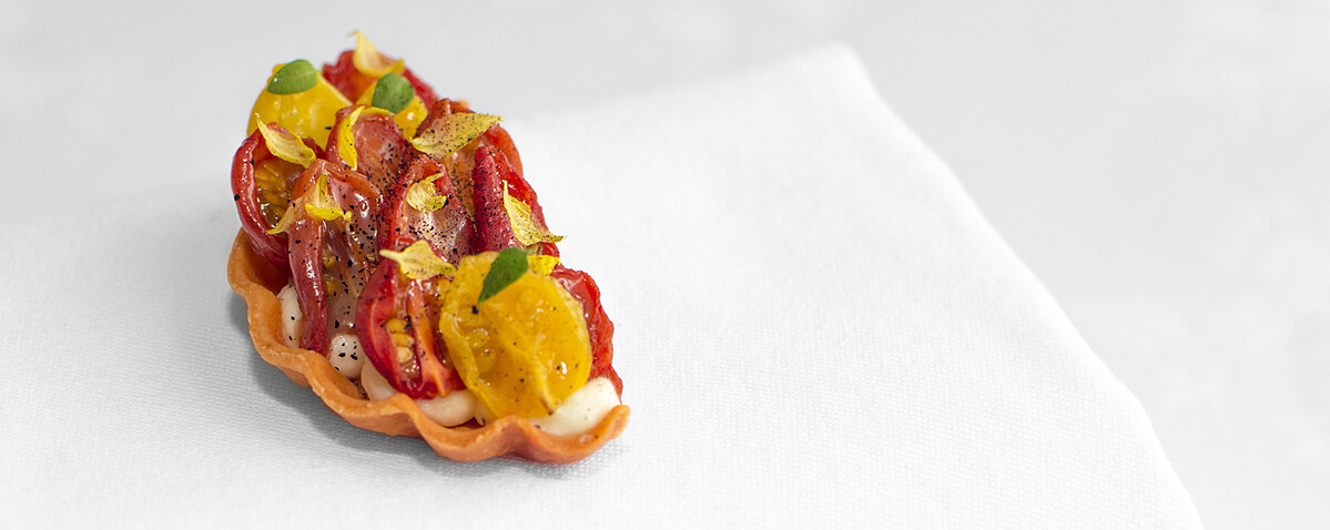 「Aperitif」意旨為法文的開胃酒、餐前酒,這樣的核心概念也投射至餐廳二○年代的復古奢華風格,黑白棋盤的地板、華麗的桌椅、挑高的天花板,點綴大理石、黃銅和深色木頭細節,彷彿走進歐陸,也應對了印尼曾被荷蘭殖名的歷史。而這裡最有名的八道Tasting Menu無疑是視覺、嗅覺和味覺的饗宴,悉心製作的每道菜色都由如藝術品般讓人捨不得吃。開胃菜的番茄小點就是最新鮮的開始,與昆布的細緻風味、帕米森起司和黑蒜的結合讓人胃口大開。
