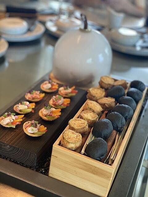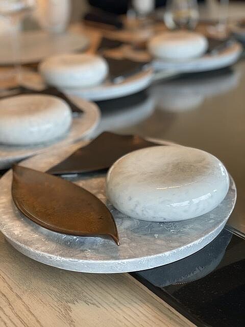 UKAI鐵板燒不僅使用最新鮮的食材,講究引出食材天然美味的料理方法。餐具皆全數來自日本,十分精緻,滿足感官體驗,若有機會來一嚐,可以翻翻盤底的日本設計師名家簽名,在場的人笑說:太美了,應該兼售餐具,一定大賣,料理長回覆:連我們都要訂購很久才拿到!