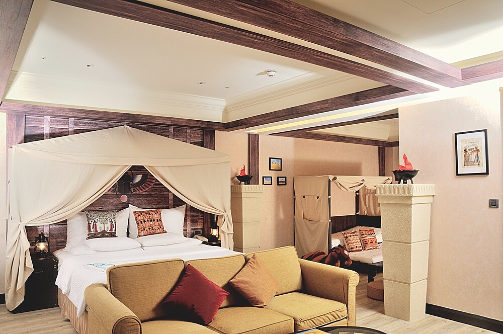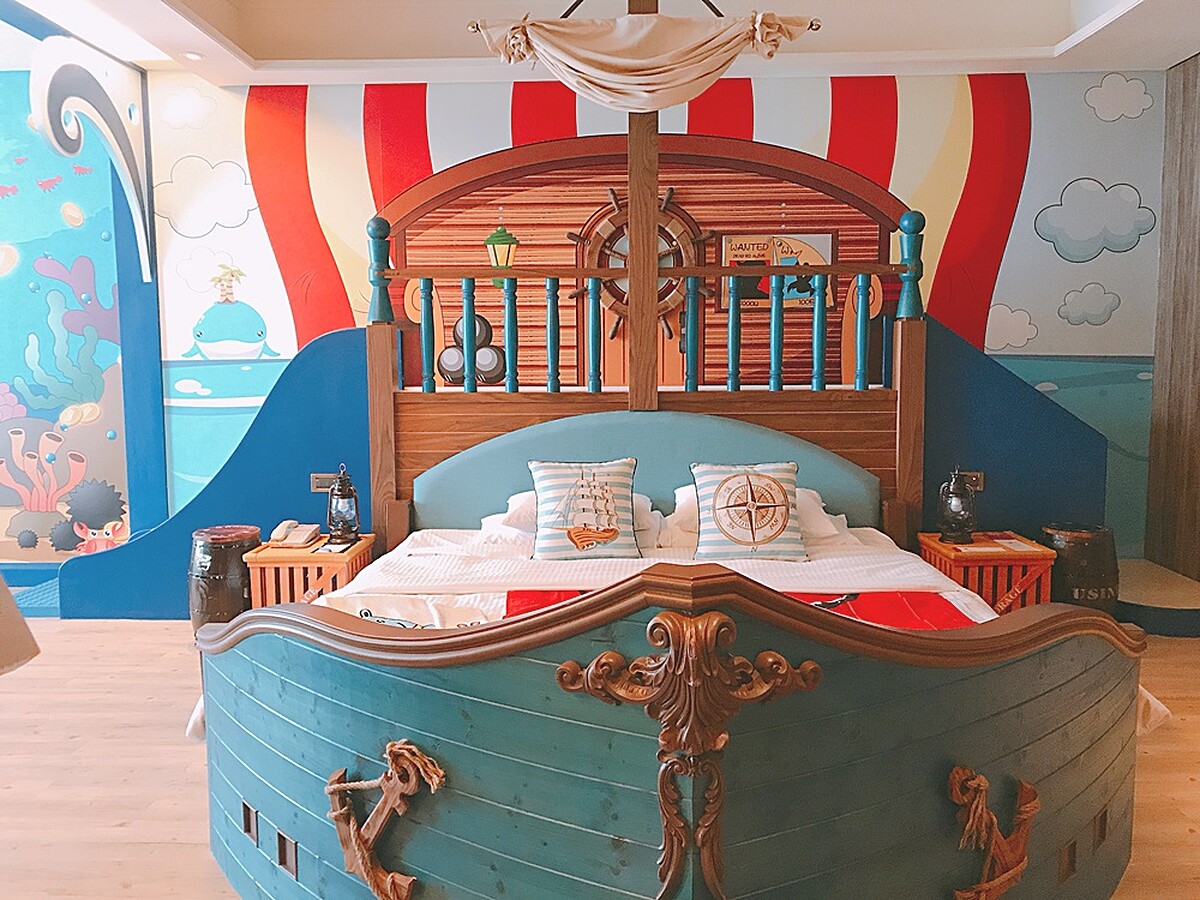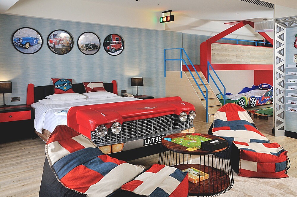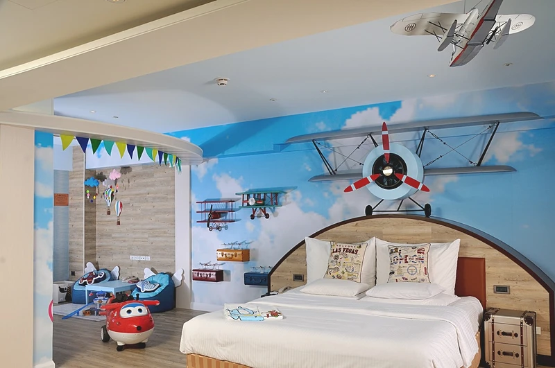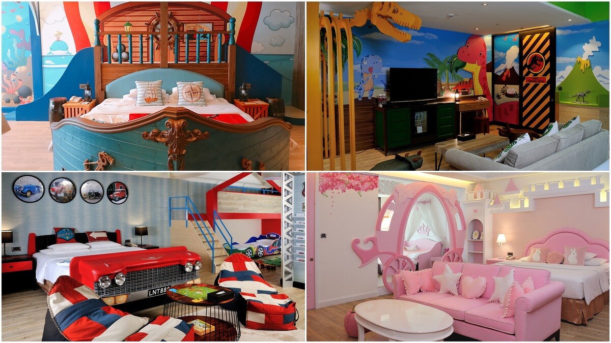 隨著親子旅遊的風氣盛行,義大皇家酒店鎖定親子客群,新增6款親子主題套房,其中包含激速賽車、考古探險、小公主、飛行屋等,除了大人的床鋪之外,更專為小朋友設計專屬自己的小床,此外,還有孩童遊戲區。