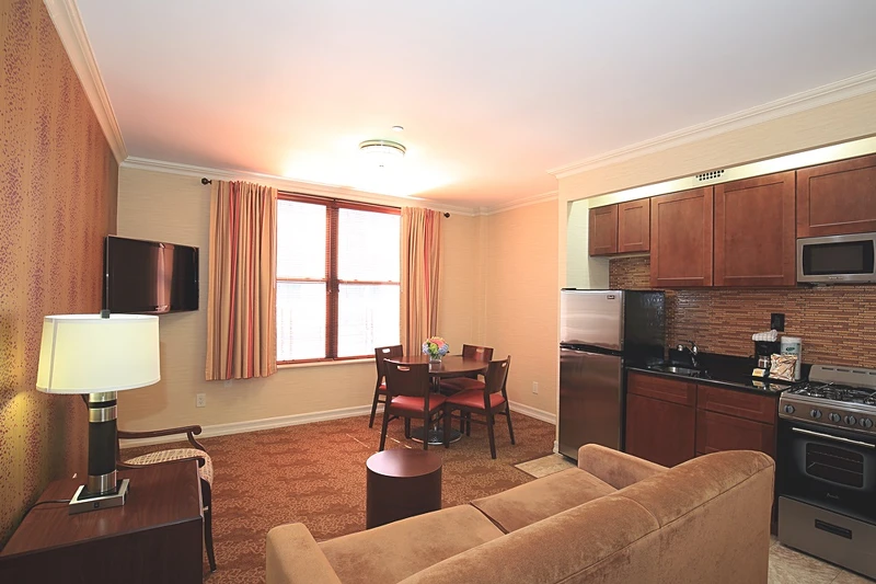 位於美國紐約市中心的無線電城市公寓,除了步行即可抵達洛克菲勒中心外,從窗外還能看到百萬天際線夜景,旅客能在此好好感受大蘋果的城市魅力。