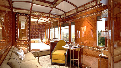 創造古典列車奢華的下榻新境界,套房價格每人5,500英鎊起跳,車廂套房裡設有淋浴間的私人浴室,雙人床和起居間, 呈現極致時尚與舒適空間。手工木雕和壓紋皮革展現出奢華浪漫的伊斯坦 布爾,別緻優雅的裝飾折射出巴黎的高級定制時尚和上乘美食。真絲布藝、銀灰色調、手工玻璃 配以巴洛克風格裝飾交織出威尼斯的宏偉氣派。