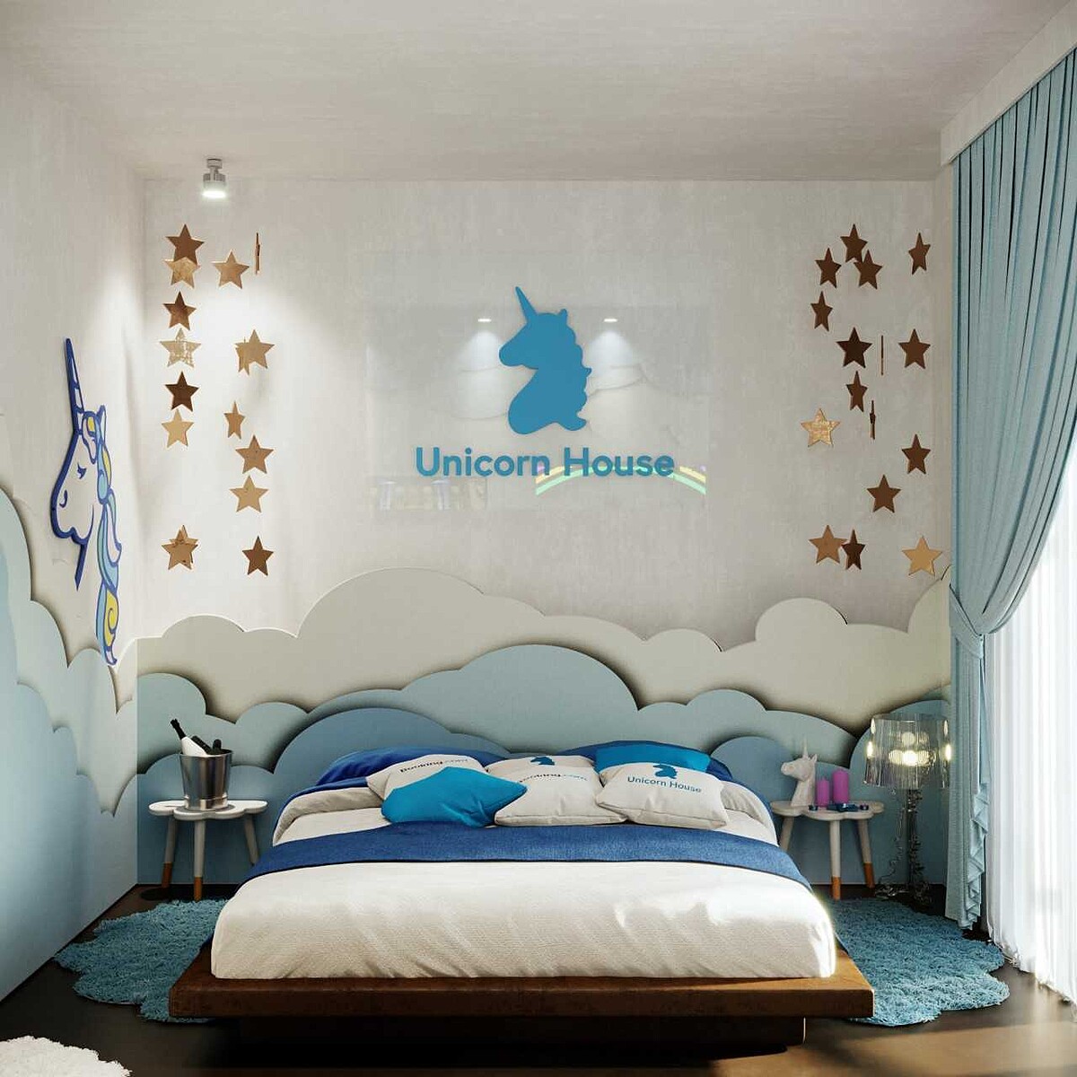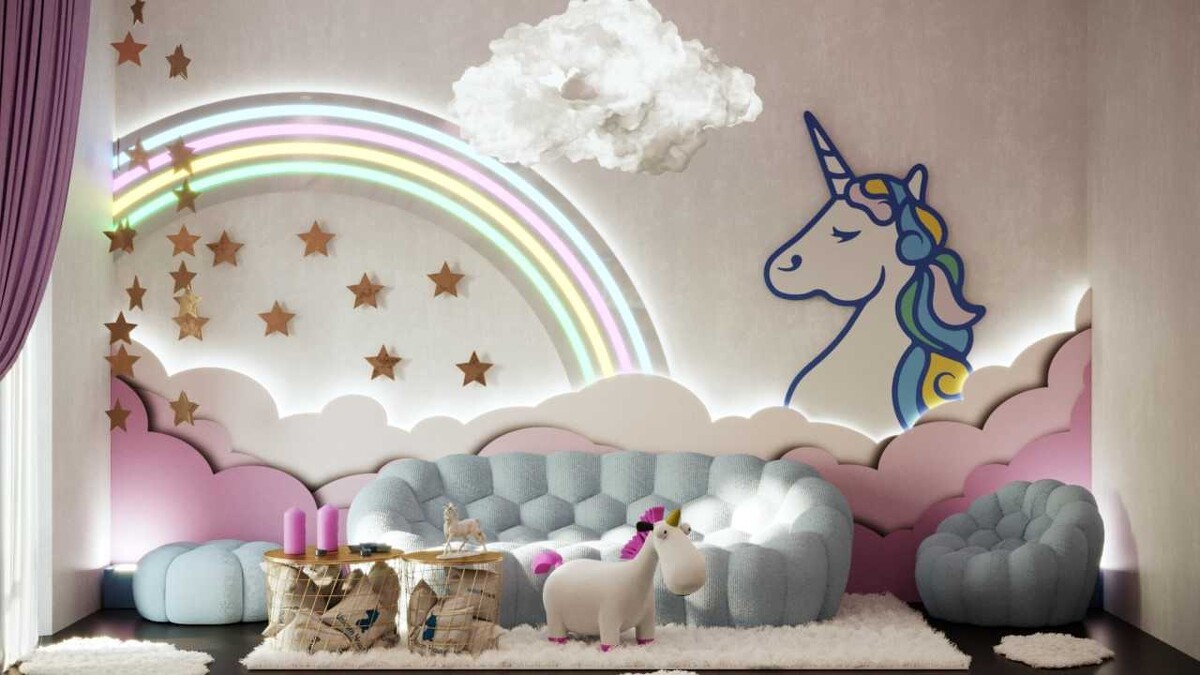 這間獨角獸之屋以粉嫩的糖果色系妝點而成,除了滿滿的獨角獸元素,四周牆面上還佈滿童話般的可愛裝飾,包括金色小星星、絢爛的彩虹,以及藍粉色系的雲朵襯托,擺設上更特製蓬鬆雲朵造型的吊燈以及可愛的獨角獸玩偶。