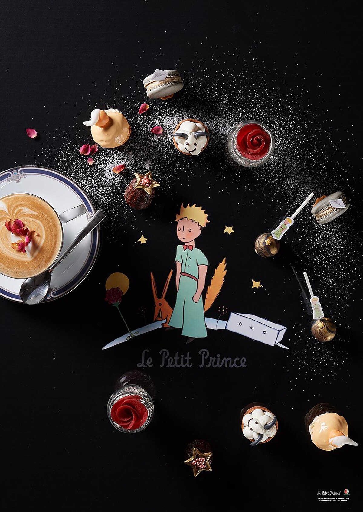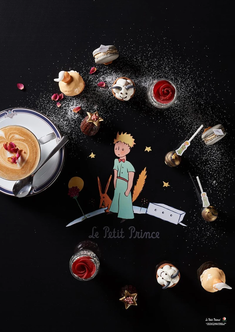 午茶甜品也不馬虎,呼應小王子故事,玫瑰及草莓調製而成的「莓天開心」,酸酸甜甜的味道,搭配活潑的氣泡躍動於清透杯中,展露春暖花開的愉快心情,還有選用LAVAZZA香醇咖啡豆與玫瑰果露的「玫瑰拿鐵」,喜歡茶系列的朋友,可選擇「玫瑰奶茶」或「玫瑰冰茶」。精緻雙人下午茶每套NT$1,680+10%,每日14:00-17:00限量供應。