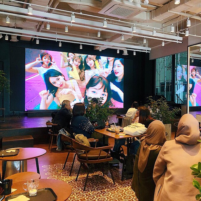 店內投影幕上輪播JYP旗下所有歌手的最新MV,讓粉絲們可以邊享用餐點邊欣賞。