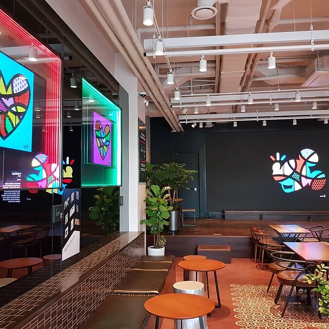 牆上電視播放韓國藝術家的畫作,讓內部陳設更繽紛有朝氣。
