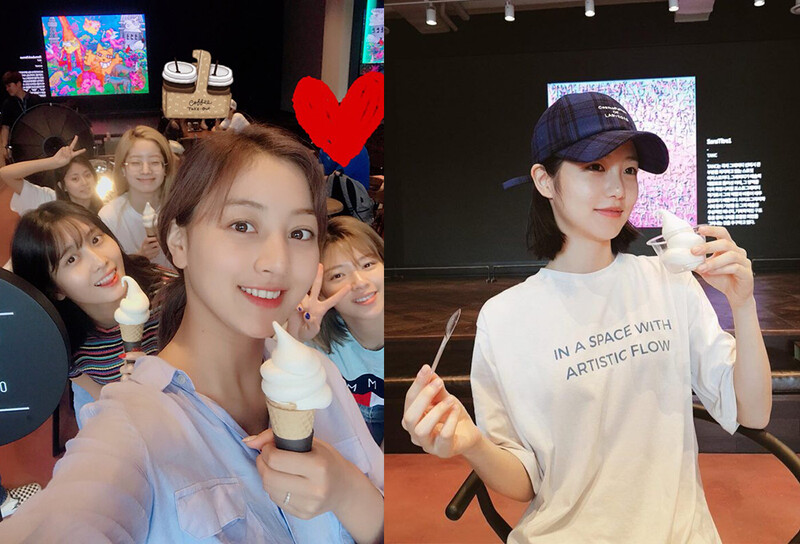 (左)Twice的子瑜、多賢、Momo、定延和志效在店內享用餅乾裝的機冰淇淋。(右)以網路劇《A-TEEN》走紅,並在tvN熱播劇《會讀心術的那小子》裡擔任女主角的JYP新人演員辛睿恩也曾在IG分享吃冰淇淋的照片。