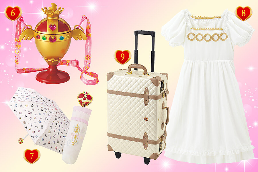 其他周邊商品如聖杯造型飲料杯、雨傘、行李箱、髮夾,甚至還有限定餐點,從沙拉、水果吐司與「月光心鑽」甜點,立刻化身美少女戰士,鐵粉們還等甚麼?