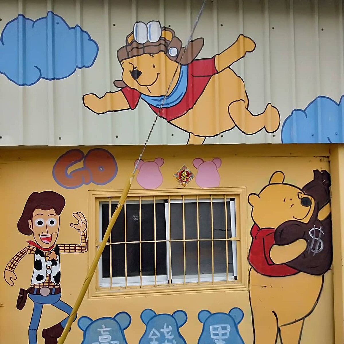 位於台南下營的「小熊維尼彩繪村」,是由當地年輕人為了美化平房古厝,開始在房舍上作畫。以小熊維尼為主角,有大大的雙手托頭姿勢,或是開心的招手,宛如置身牠的童話世界中,一看到心情立刻好起來。