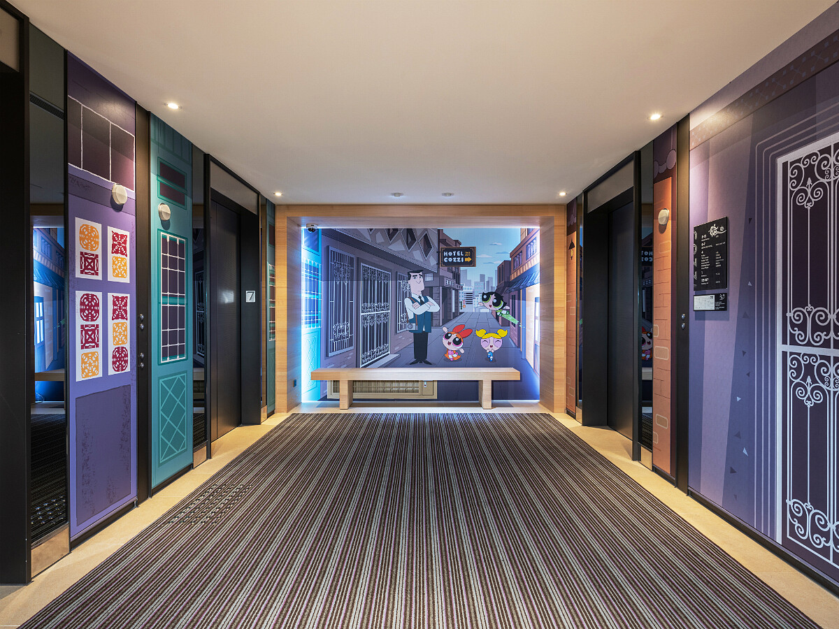 從旅館門口就能看到3.5公尺高的探險活寶戶外裝置,走進1樓迎賓大廳或B5~B7停車場,也能看到卡通明星身影。而抵達各樓層時,電梯一打開便能看到走廊有許多情境壁貼,上面有卡通明星穿梭在台南神農街的畫面,展現創意與府城懷舊風情結合的魅力。