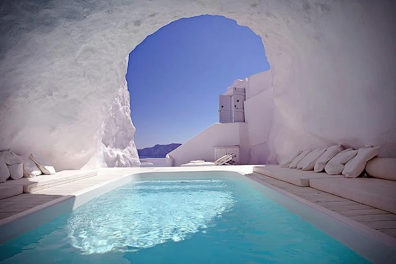 被譽為希臘最美酒店,處於希臘聖托里尼島(Santorini)的超五星酒店Katikies Hotel座落在愛情海上300英呎高的懸崖邊,依伴著Oia的懸崖,讓旅人享受絕美的景色。奢華的場景當然有著要價不斐的價位!擁有 Seltz Champagne Restaurant&Bar餐廳和Mikrasia Restaurant餐廳。酒店的無邊游泳池享有火山口一覽無遺的景緻,全白的房間宛如住在畫裡面,夢幻到讓人驚艷!
