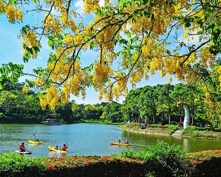 在初夏之際,正式阿勃勒花盛開之時,台南隨處都能看到黃花綻放!而在虎頭埤風景區則能看到400多株阿勃勒樹滿開,呈現如「黃金雨」的夢幻風景。還能在烏山頭水庫坐船、騎單車遊湖,肯定玩得不亦樂乎。