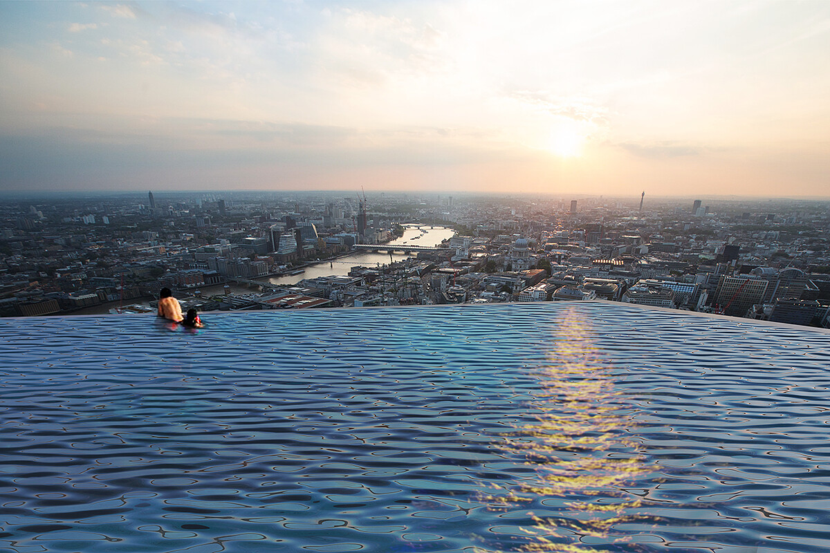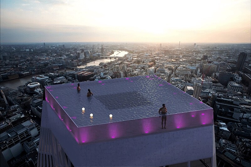 英國泳池設計建造公司Compass Pools日前宣布將建造Infinity London,離地面約有超過200公尺距離、蓄水600,000升。以特殊材質取代玻璃打造,能讓泳池看起來更加清晰,游泳池的地板也是透明的,酒店客人抬頭就能看到游泳的人的姿態。