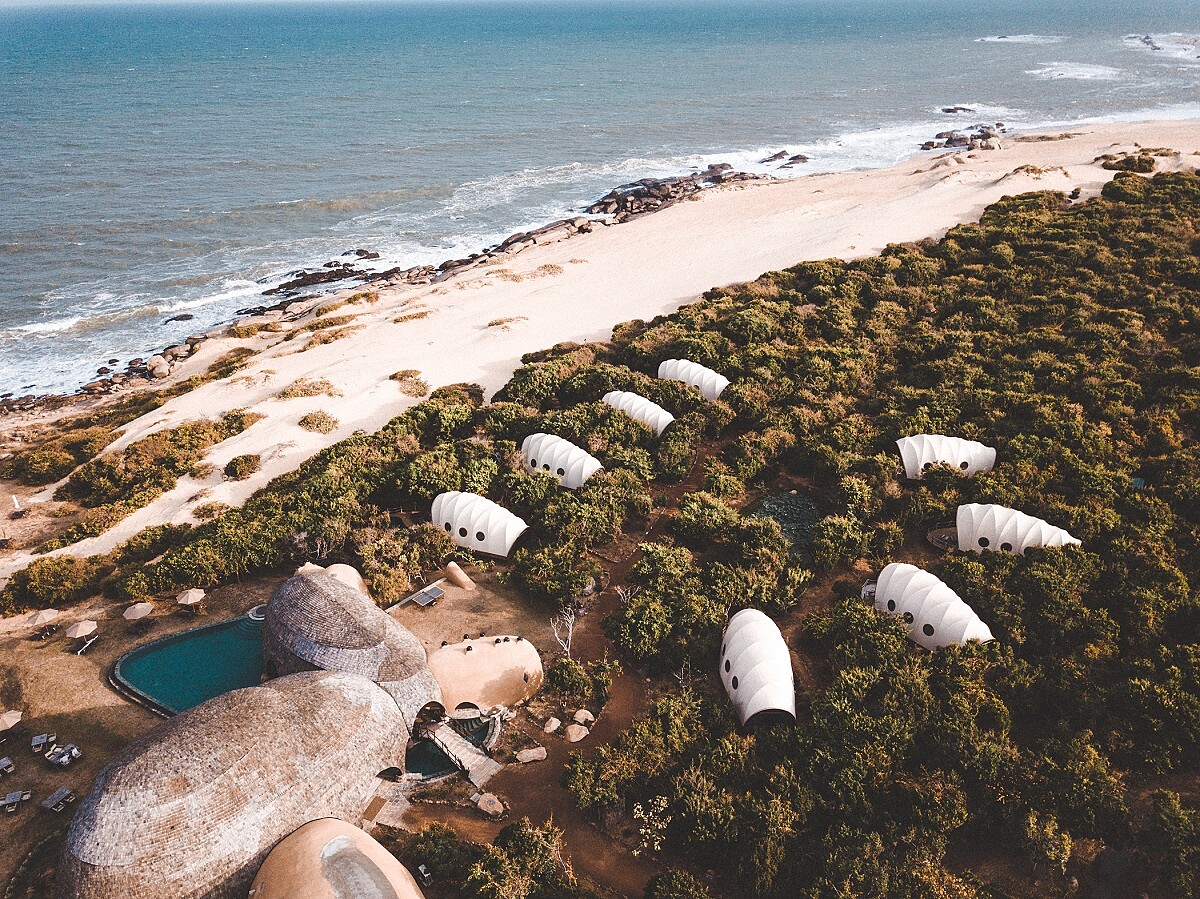 座落於亞拉國家公園裡的Wild Coast Tented Lodge由知名度假飯店品牌Resplendent Ceylon操刀,共有28座全白繭型帳篷,與地景完美融合,帳棚的細節處更點綴著皮料,可說是最美的豪華帳棚。內裝從衛浴、沙發到高級床鋪一應俱全。融合殖民風格和當代思維,從地毯、皮質座椅、銅質浴缸到豪華的四柱臥床,將豪華野營拉高至新境界。