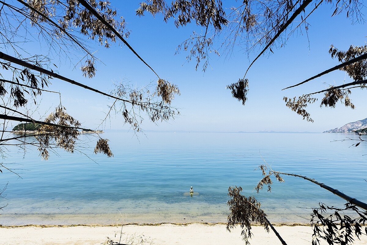 另一位台灣藝術家林舜龍的作品在小豆島北邊大部海邊,入口掛滿台灣小朋友手寫的風鈴,進入巨大竹製圓球的內部底端,有個小平台可以看到海邊,旁邊還有旋轉梯可以繞下去海灘,入口到出口的空間感體驗很奇幻,在裡面感覺很像擁有這一片海灘,到外面看整件作品像是一顆巨大的海膽。