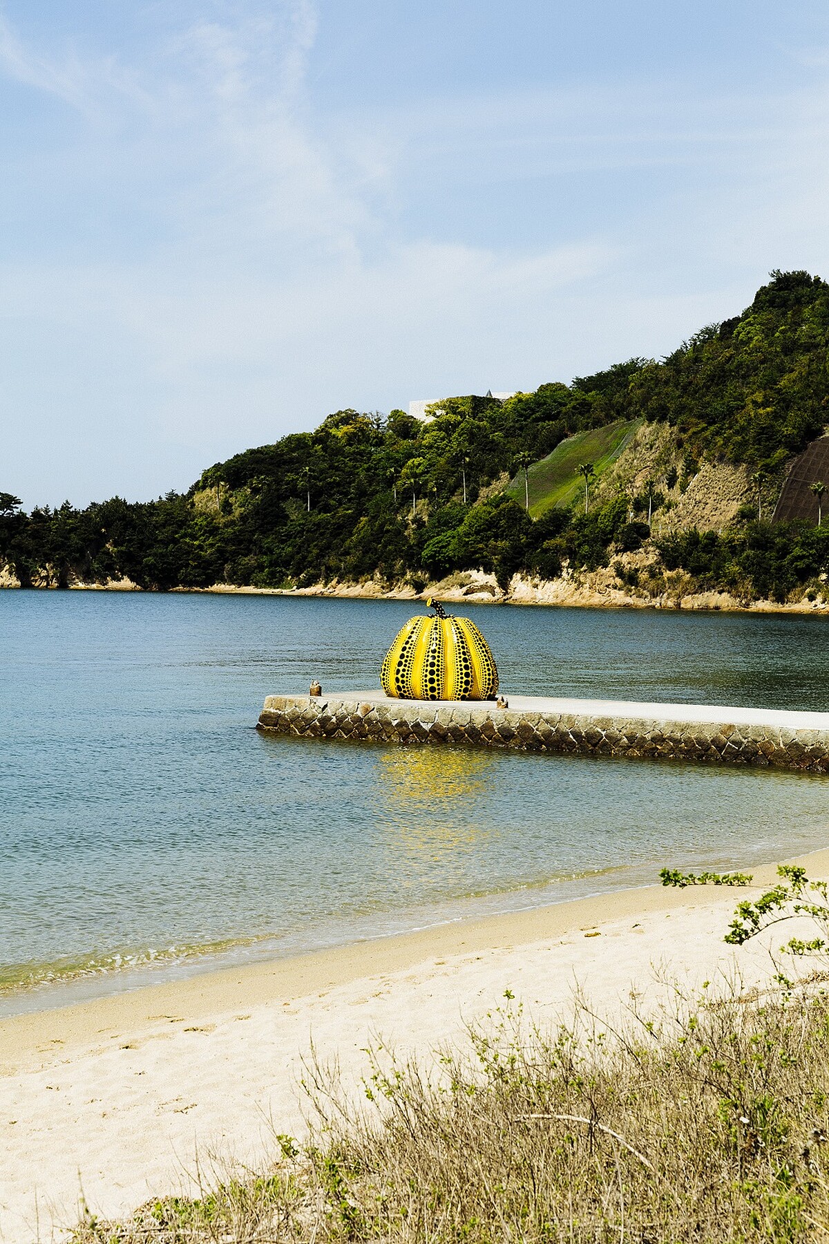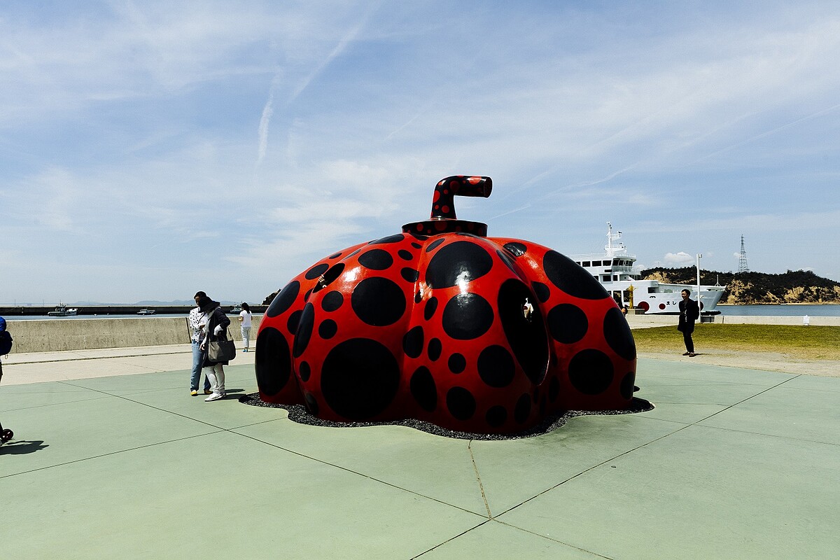 直島是我唯一安排有在島上住宿的地點,其他地方都在高松市,後來旅行完才發現跳島住宿比較推薦,可以省去很多搭船往返的時間。直島的渡輪裝潢很多藝術品,想必是呼應這個最早開始發展藝術觀光產業的島嶼吧,一抵達宮浦港就會看到草間彌生的紅南瓜。