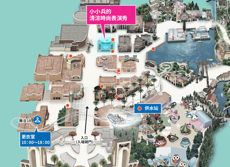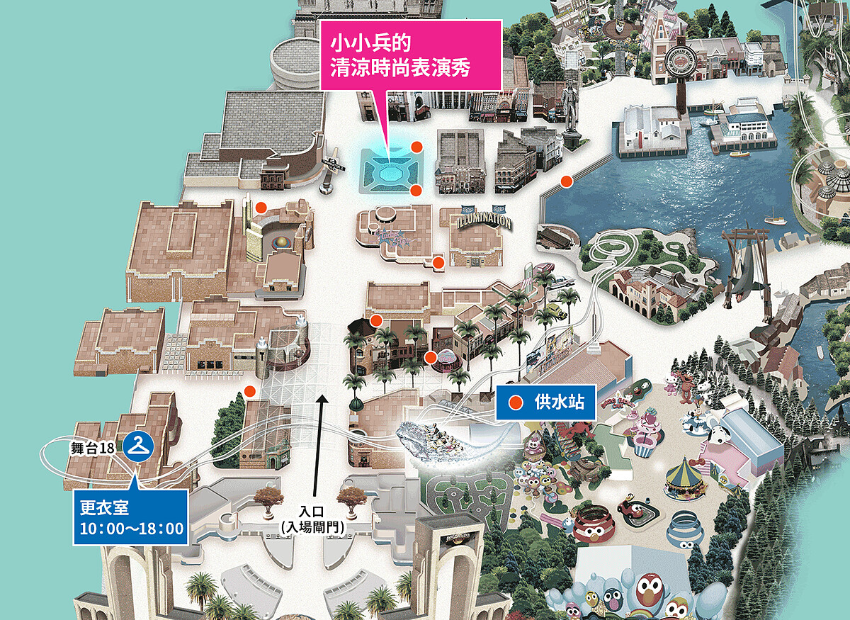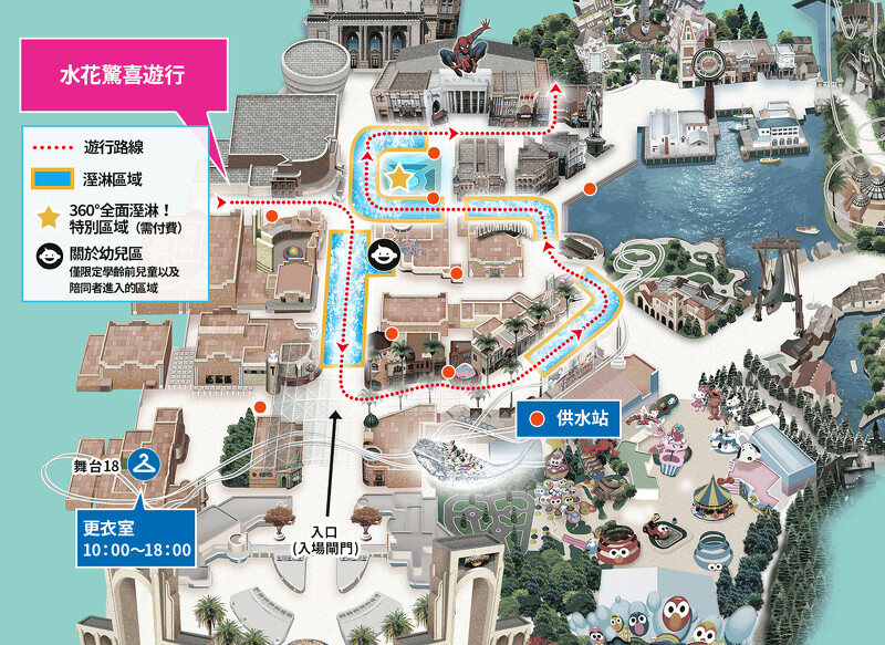 這次推出的夏日限定活動,絕對讓大家暑氣全消!每日一場的水槍大亂鬥,在遊行的途中,表演者會拿起水槍與大家互動,想要參加這場水槍大戰的朋友們,建議可以在遊行開始前先將水槍準備好,到指定地點補水,遊行開始時不用客氣一起盡情地發射手中的水花噴槍吧!