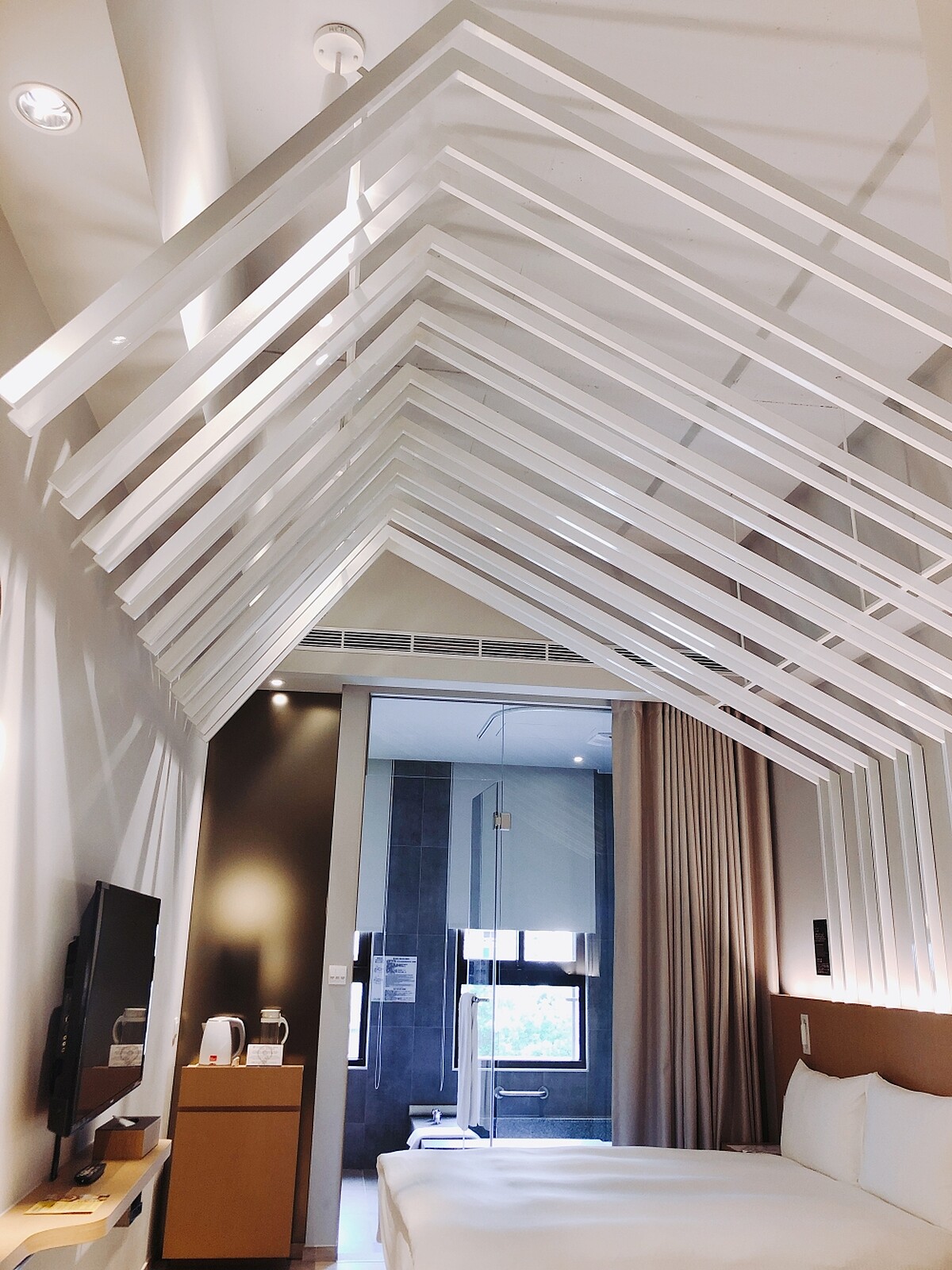 「品泉雙人房」、「品旅雙人房」、「文漾家庭房」三種房型延伸溫室概念,天花板設計打造如同溫室屋頂的白色鋼架,更留下水泥原始紋路,呈現原始自然風貌。