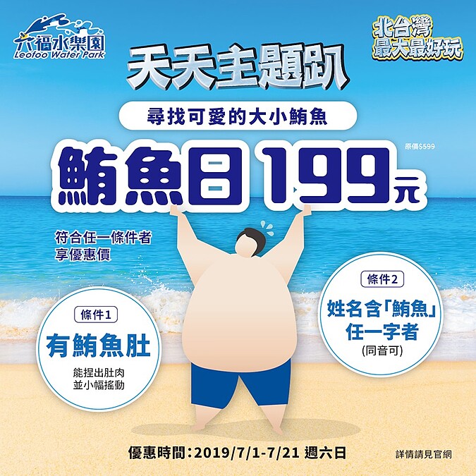 還在苦惱肚子還沒瘦下來,夏天就已經到來了嗎?別再遮遮掩掩你的小肚肚,因為這可以讓你享有優惠!六福水樂園推出「鮪魚日」,只要小腹能捏出肚肉,就能享有以199元入園的優惠,大方露出小肚肚吧!