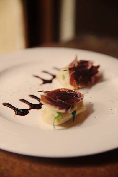 選用來自西班牙的伊比利豬火腿、芝麻葉與阿里山轎篙筍,火腿中的淡淡堅果香氣,加上芝麻葉及鮮甜的轎篙筍,清爽不膩口!