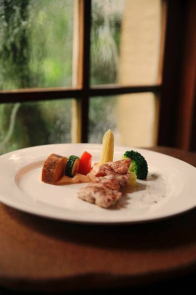 選用放養在雲林山區8個月到一年不打抗生素的放山雞,搭配馬鈴薯泥、台農9號地瓜、玉米筍、櫛瓜、番茄、花椰菜等蔬菜。