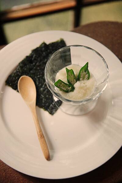 三兄弟分別是納豆、山藥和秋葵,用旁邊的海苔將三兄弟捲起來一口吃下,綿密的口感加上海苔的清脆,簡單又養生。