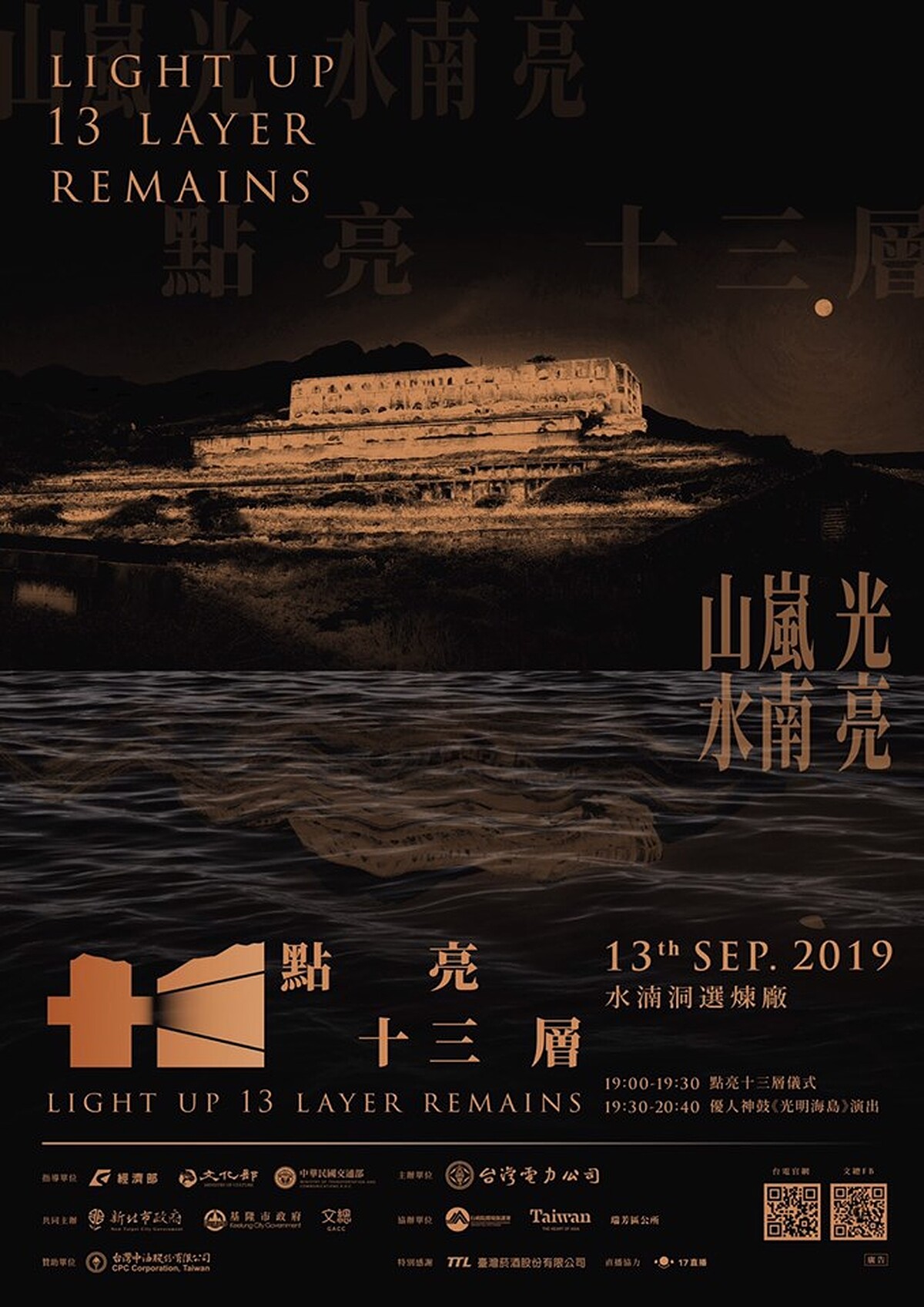 現在為了要重現水湳洞選煉廠遺址昔日歷史風貌,將於中秋節9/13(日)晚上推出「「點亮十三層」公共藝術。攜手國際照明藝術大師周鍊、新銳藝術家何采柔,依照十三層遺址特色設計不同亮度的琥珀色柔和燈光,讓這美麗的廢墟再次綻放黃金光芒,並帶領觀眾重溫美好時光。