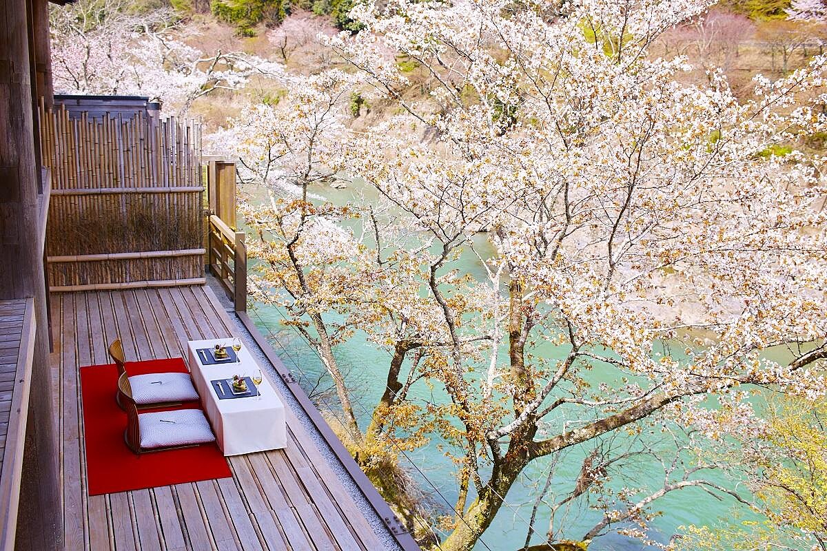 嵐山從平安時代就以詩意環境吸引貴族居住聞名,旅人從渡月橋順著大堰川而上,延著峽谷建築的旅館就能印入眼簾。設計和建築上,運用傳統京都技法,並以創新的想法建構了詩意而風雅的美好空間。以「水邊的私邸」為概念,活用百年建築的意趣建成的日式建築,一眼望去就能看見自然的流動,這裏更是最能夠體驗日本人所謂春夏秋冬的季節美好。
