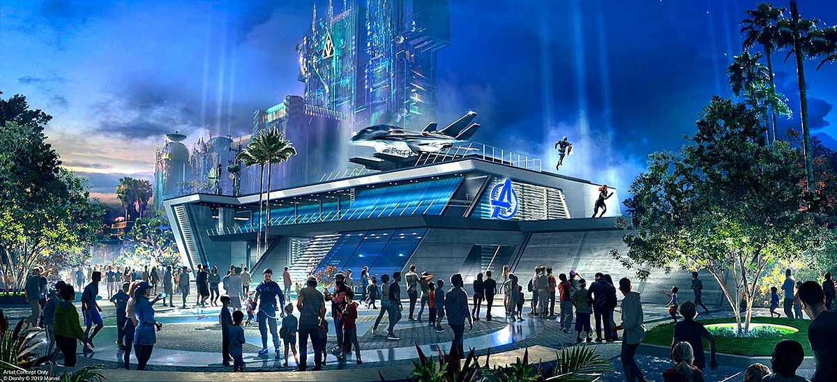 預計將於第二階段開放的復仇者聯盟總部大樓,以史塔克企業科技感大樓為外型,將成為加州園區的標誌性建築,。漫威迷們可以踏上遊樂設施「昆式戰鬥機」(Quinjet),跟其他超級英雄一起飛往《黑豹》裡面「瓦坎達Wakanda」王國、來一場激烈空戰。
