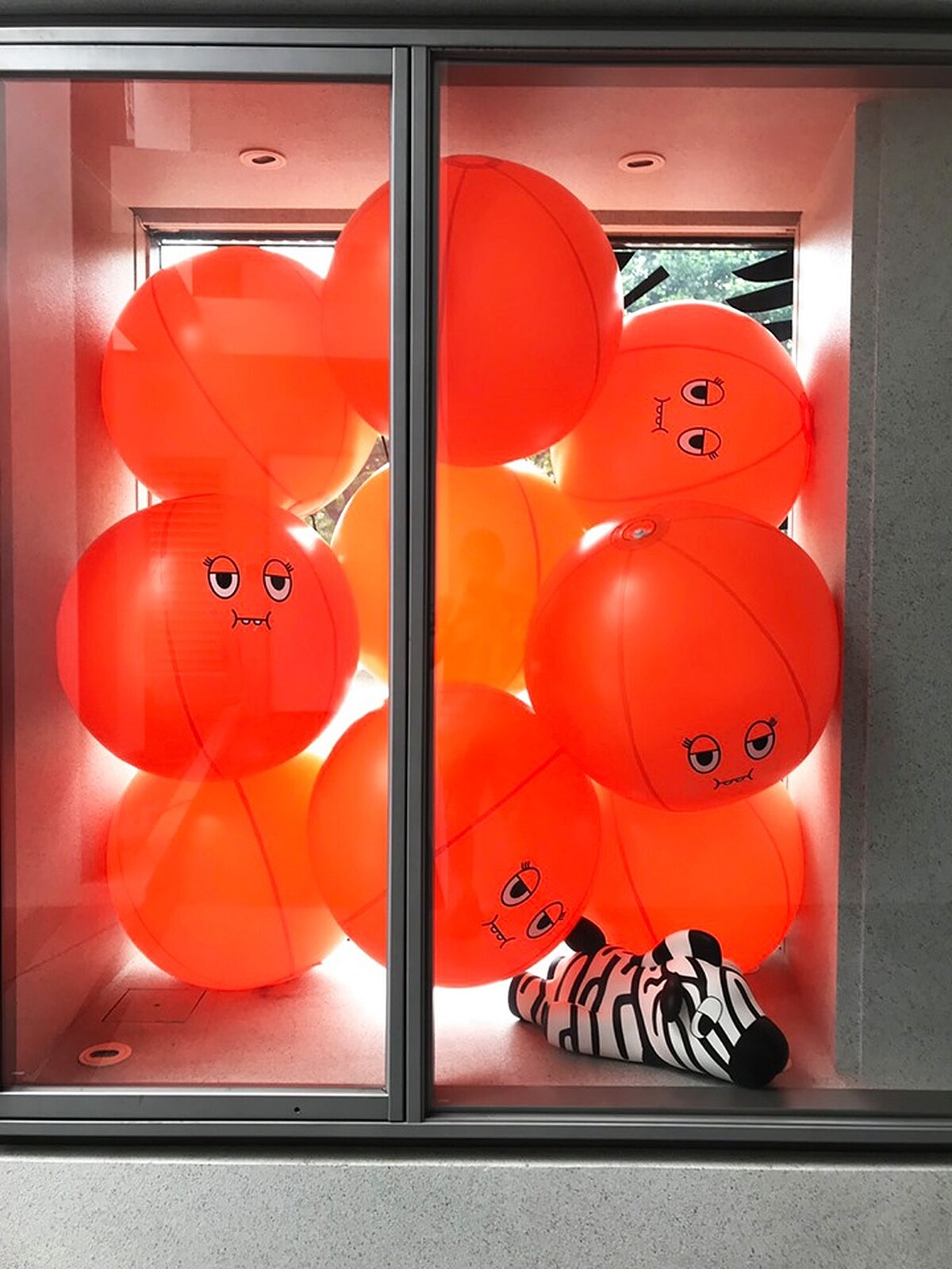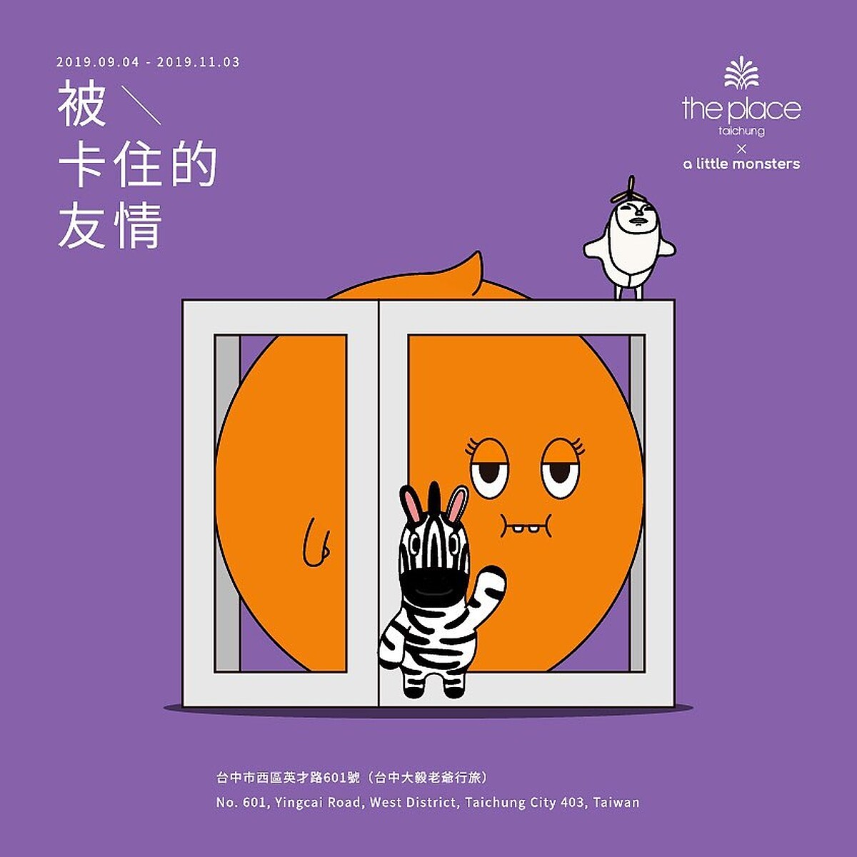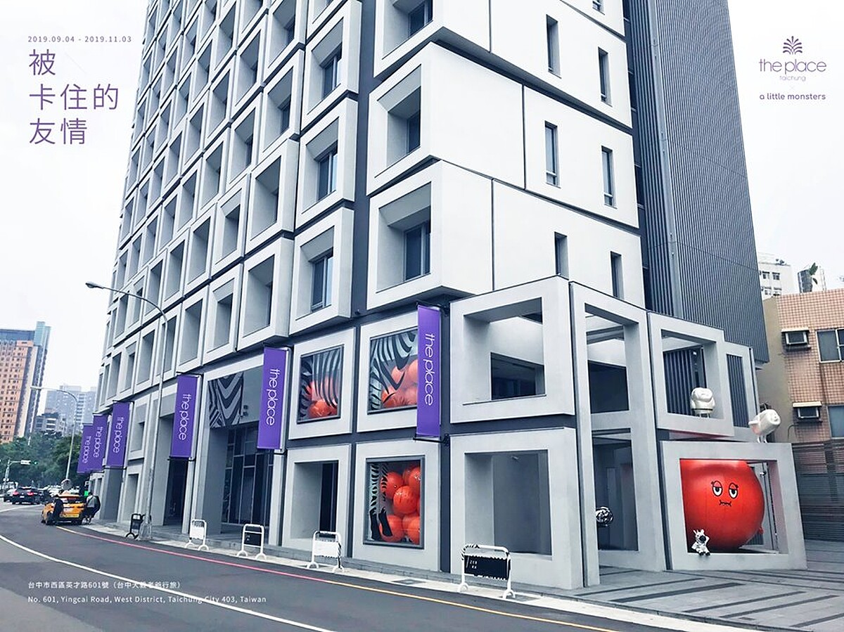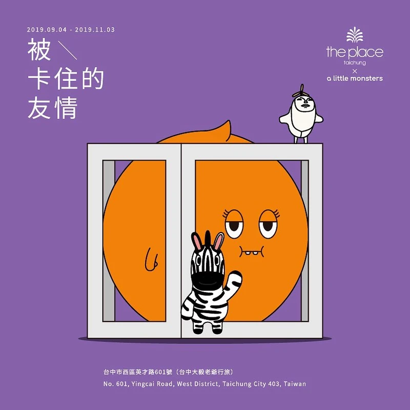 繼2017年台中市模範街、2018年在台中新光三越都以「被卡住」的模樣現身,這回則又被卡在台中大毅老爺行旅,光從外型的白色系方形格中,就能看到它搶眼的亮橘色身形,下面更有隻斑馬舉高著手,歡迎你來合照。