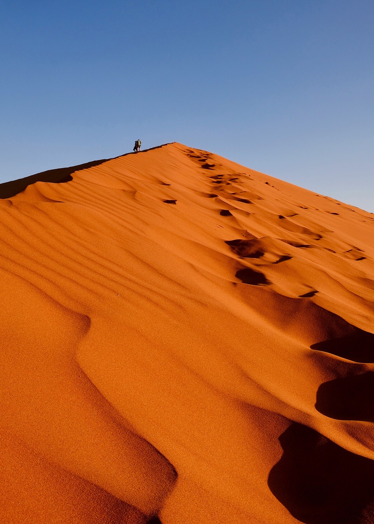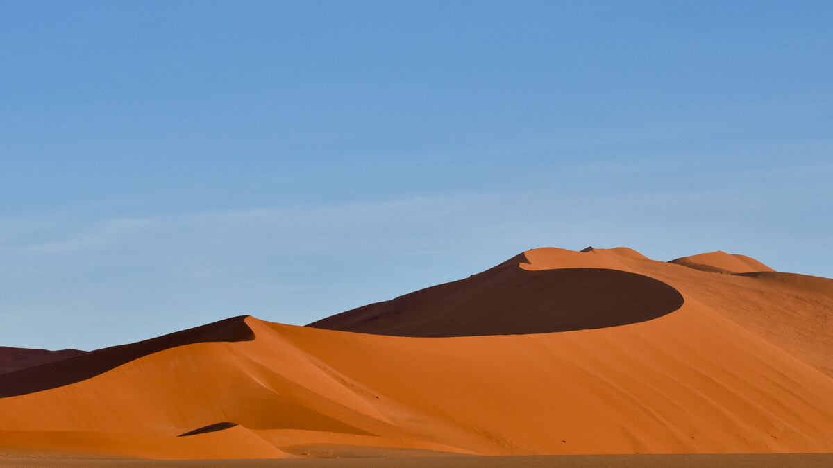 納米比沙漠有數個知名沙丘,包括Big Mama、世界最高的Dig Daddy,以及最具人氣的Dune 45沙丘。其中 Dig Daddy 沙丘,高350公尺,坡陡難行,但雖然不好走,但是卻是全球攝影師最愛取景的經典勝地。剛開始走上沙丘陡坡時,我感到十分驚恐,除了陡峭稜線讓人擔心滾下沙坡,而容易深陷的沙子路,更讓每走一步,就心慌慌的。還好最後克服恐懼,登上頂部時,隨著陽光的變化,將紅沙漠刻劃出的簡約艷麗的線條,視野全然遼闊,心曠神怡,心中滿是感動!