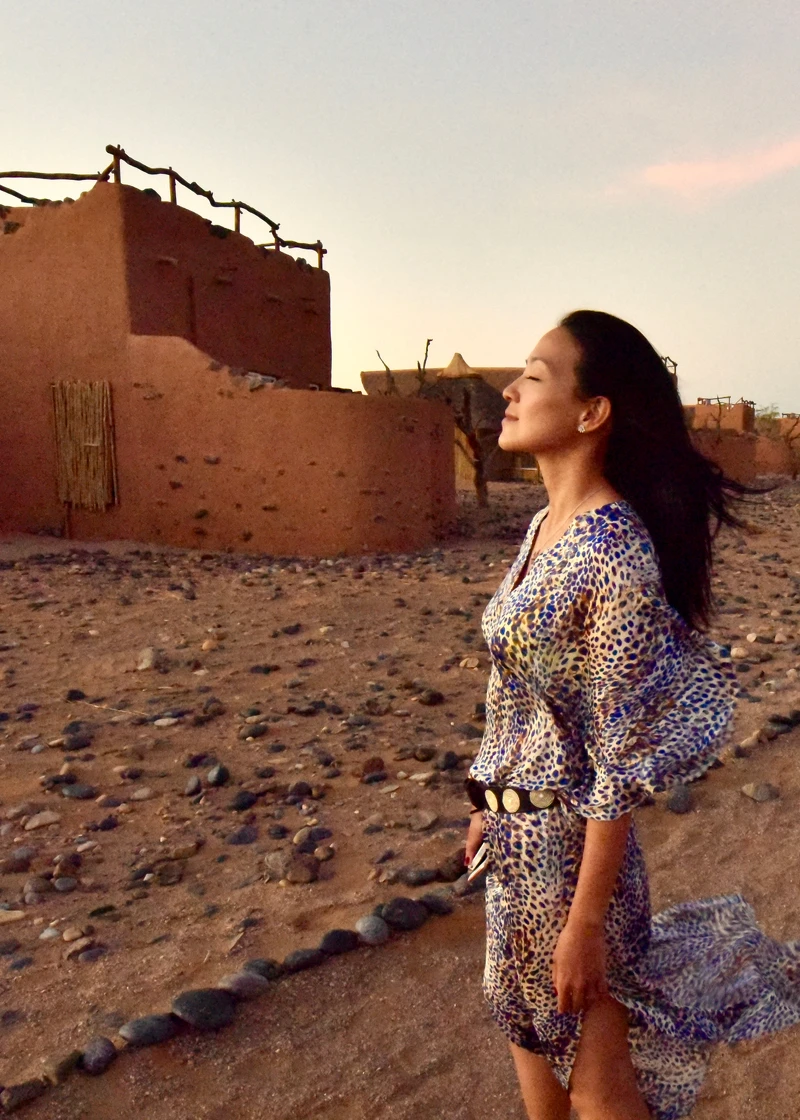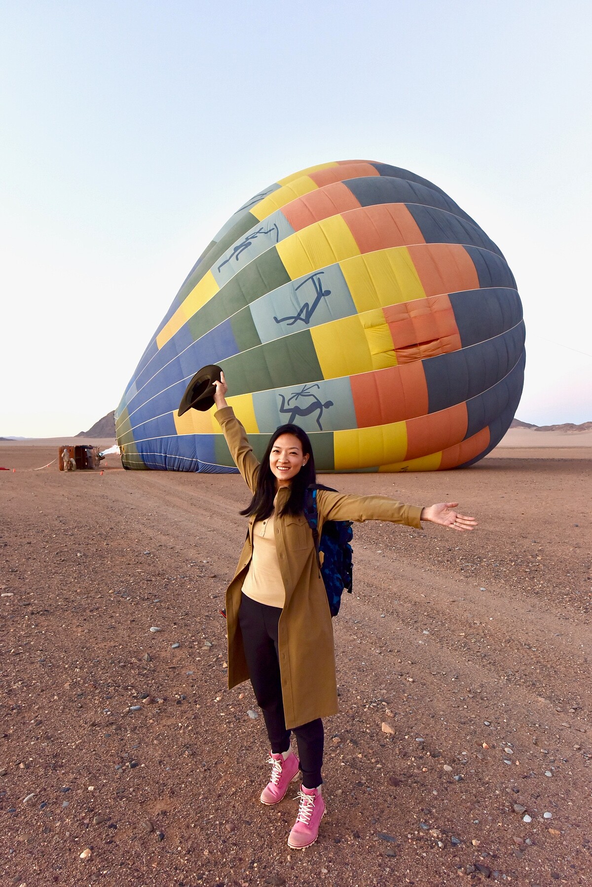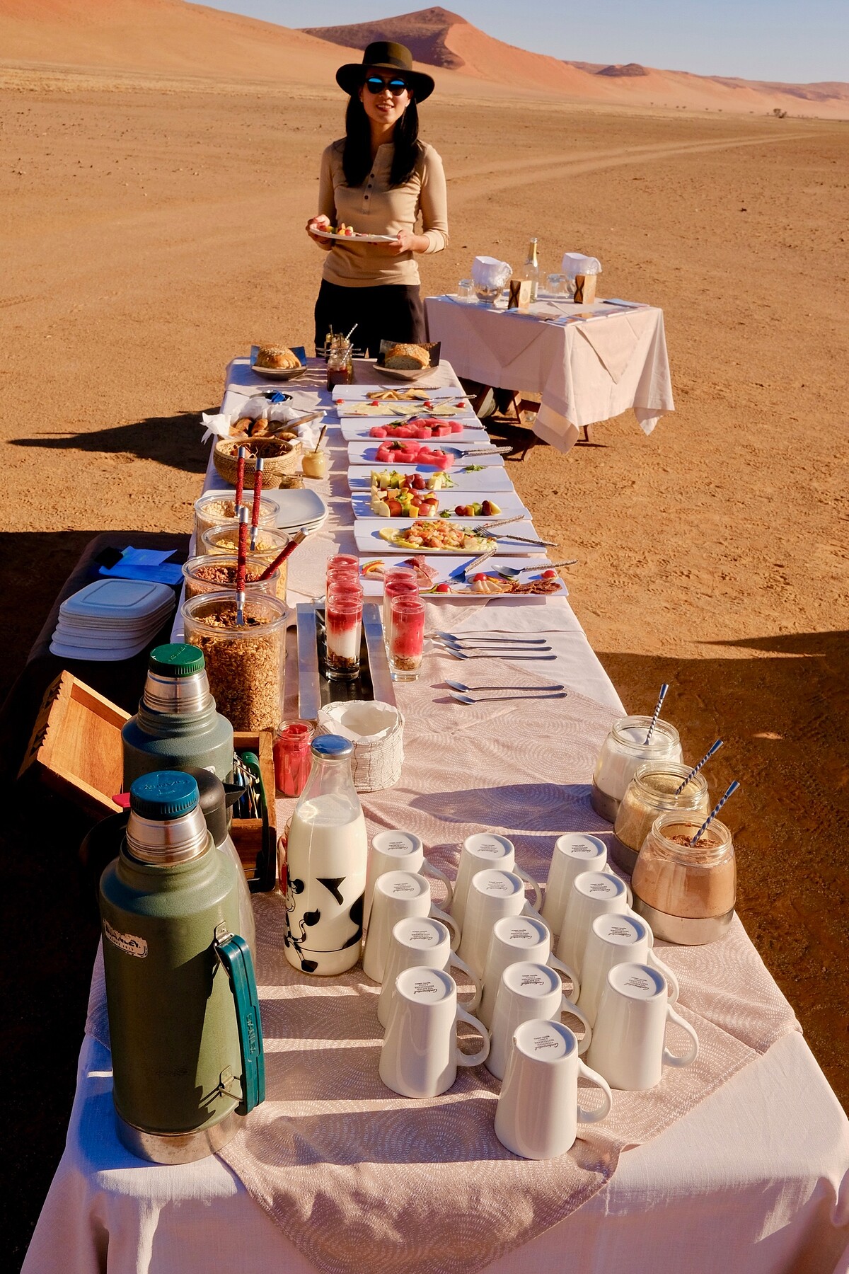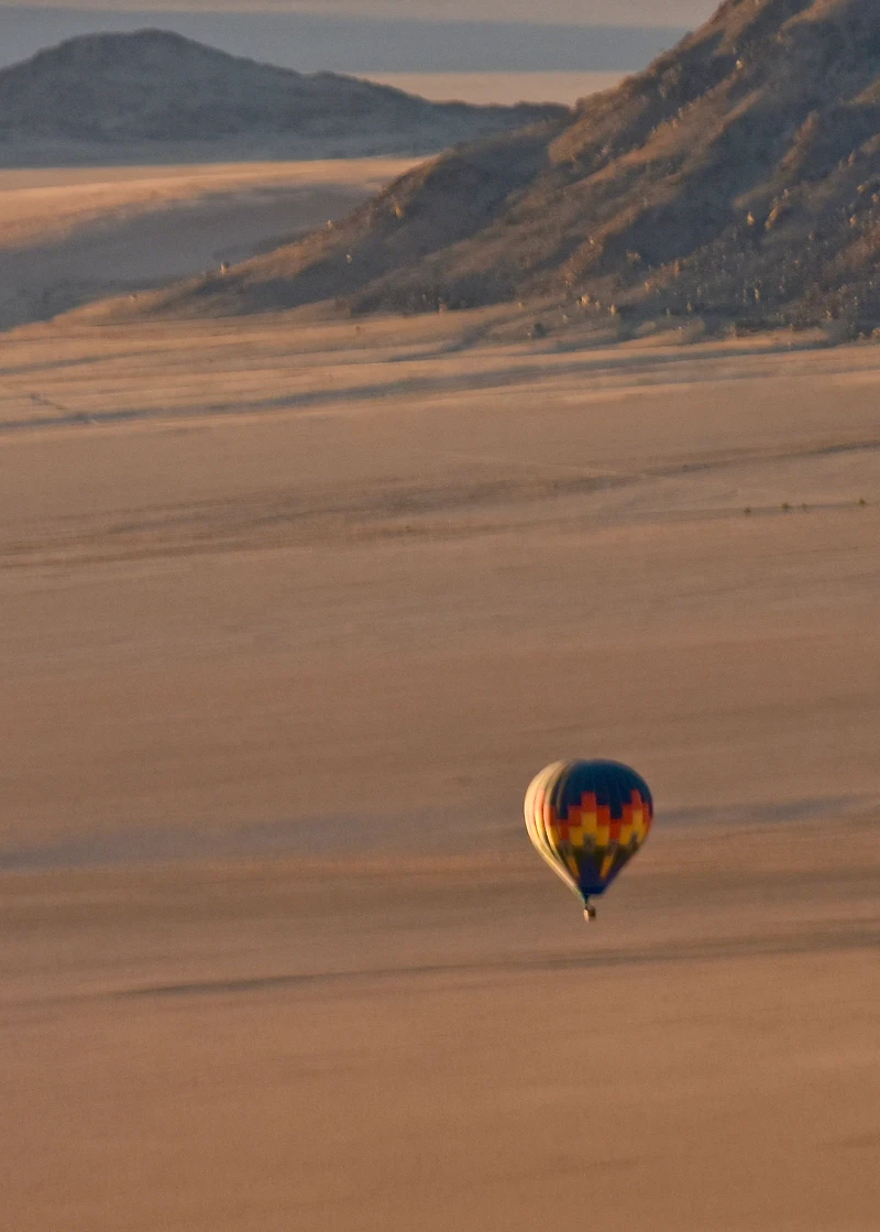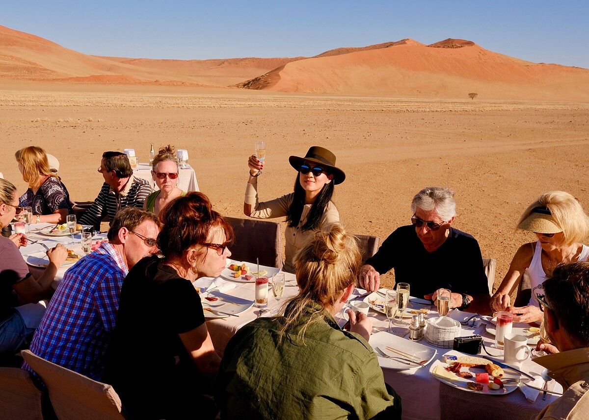 隔天清晨我們就起了大早,因為飯店安排的餐廳得要搭乘熱氣球去!從熱氣球上迎接美麗旭日,俯瞰整個紅色沙海,視野開闊,心情也跟著開朗。而所謂的餐廳,其實是逐熱氣球而擺設的餐廳。一路上,滿載著野餐餐具食物的兩輛車子,直接追著我們的熱氣球而奔馳,隨著風向而飄動的熱氣球,最後停駐一處曠野,我們從熱氣球下來後,戶外餐桌椅早已擺好,鋪上桌巾、裝飾上美麗餐具,擺好豐盛食物,導遊開了香檳,一起跟我們慶功!赤紅沙漠、寂靜曠野、香檳佳餚,還有熱情的球友(一同搭乘熱氣球的朋友),這真的是我吃過最豪華奢侈的早餐!