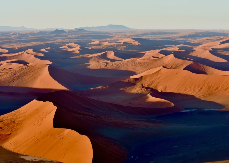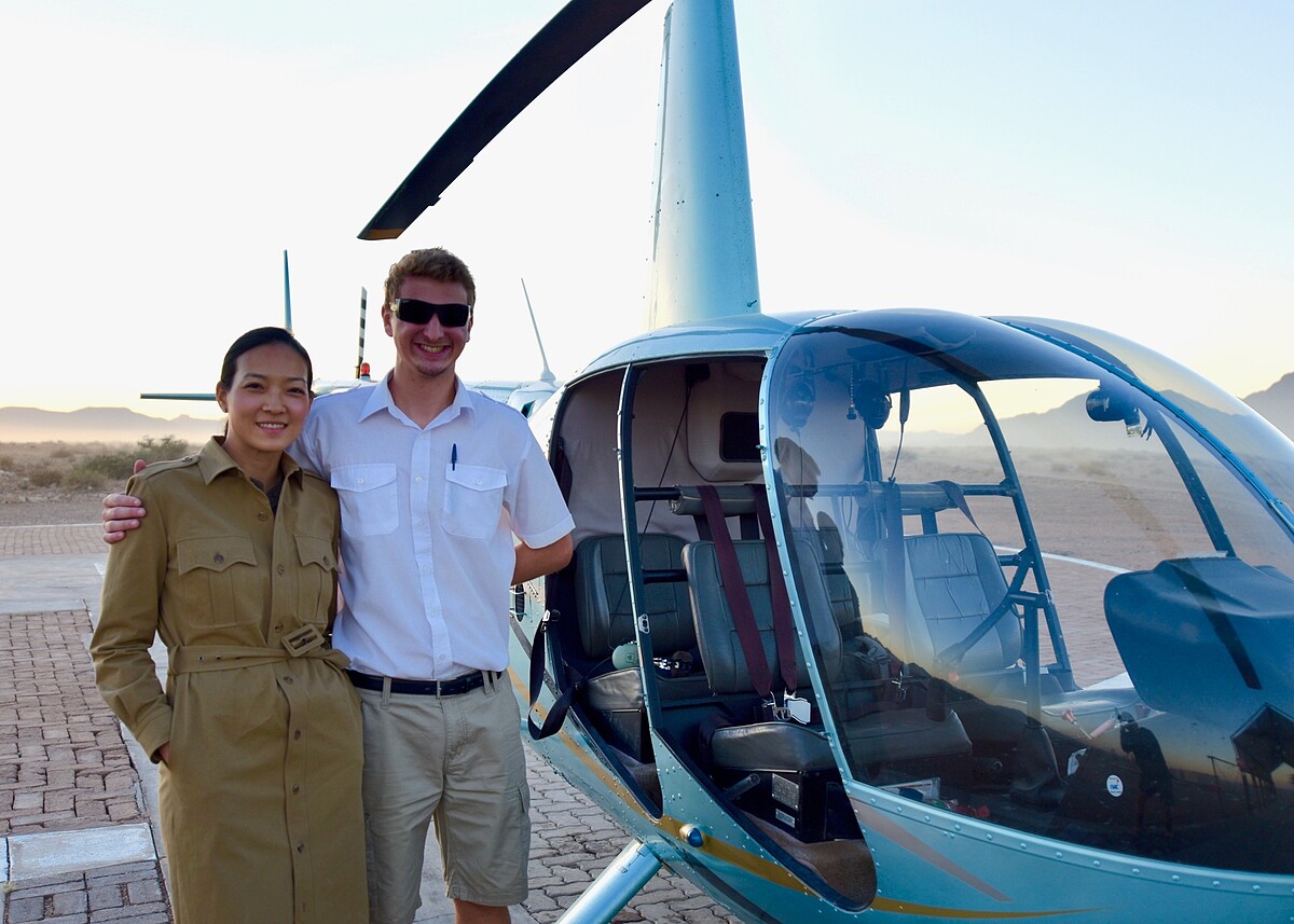 納米比沙漠的沙,因富含鐵質呈現的是特殊赤紅色。導遊隨手抓了一把紅沙,用磁石一吸,果然馬上吸附住。就如磁石般的神秘色彩,納米比沙漠一直讓全球地質學家們所深深著迷。然而我不是地質學家,只想純粹看它的美麗,而最能完整欣賞納米比沙海的方式,就是直接飛上天際!我們登上直升機,俯瞰高聳起伏的赤色沙漠,高低落差的地形,在陽光照射下,刻劃出分明線條,像是幾何畫布一樣,精彩萬分,我一直猛按快門,深怕留不住這美景!