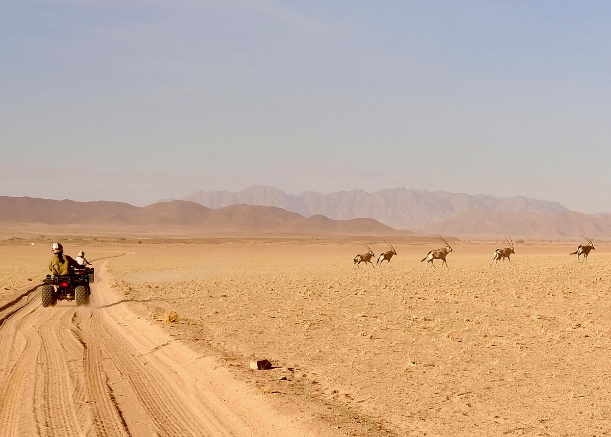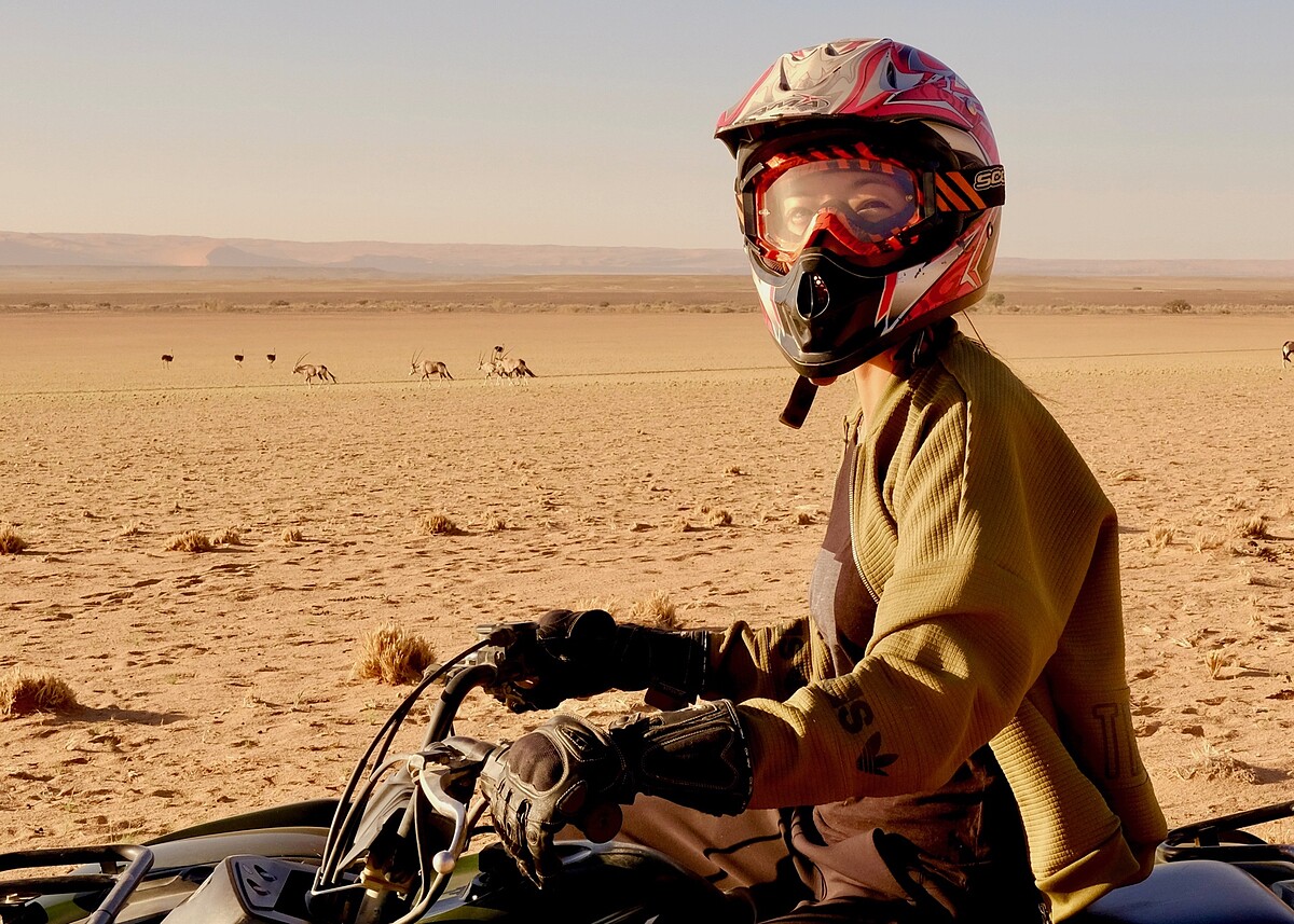 納米比亞旅程的最後一天,我們體驗了Quad Biking(四輪越野摩托車)。帶著護目鏡安全帽出發,馳騁在荒野沙漠中,甚至從高聳的沙丘上俯衝而下,非常刺激。這是我在城市裡駕車時,從來不曾有過的自在心情,覺得自己狂野又好勇敢!原本一小時行程,我們卻流連忘返的騎了兩小時,其中有段石子路,還巧遇一群野生劍羚從旁而過,場景好震撼,深深感受到自我的渺小與心境的全然自由!