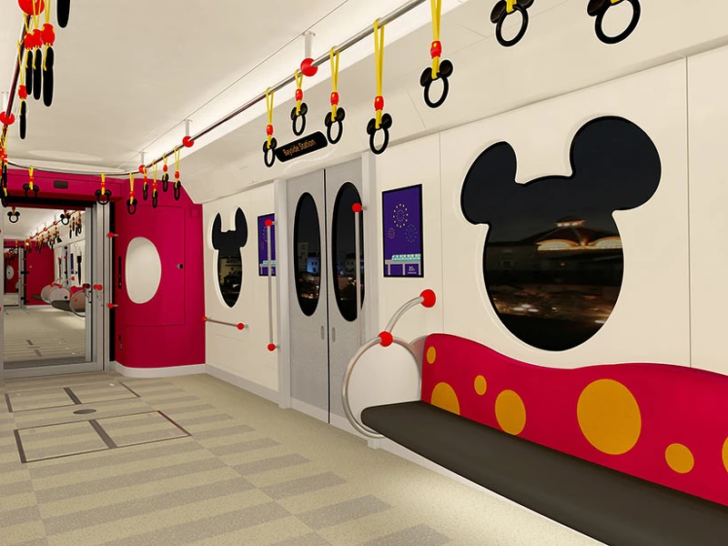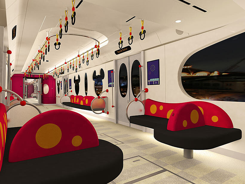 最鮮明的不同,是車廂內部空間變得更高、更寬,加長並有波浪狀的座椅形狀,更換上了經典米奇的紅黃配色、圓點設計,有著同樣配色的米奇頭把手拉環,則多了三種不同高度供大人與小孩分開使用,提昇不少活力與便利性。