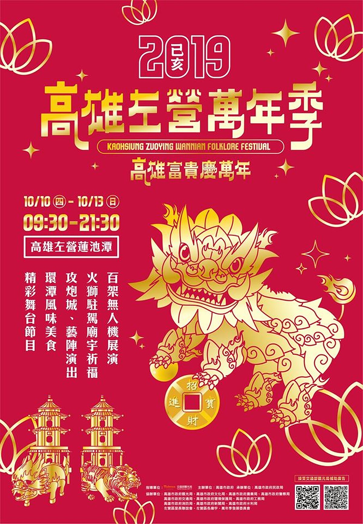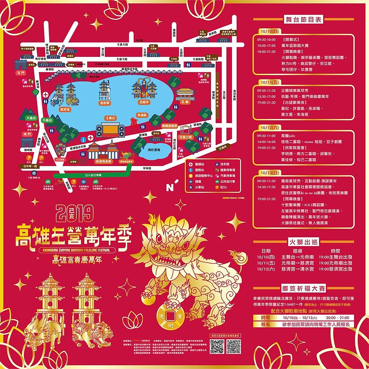 自2001年至今、每年於10月中旬在左營蓮池潭舉辦的「高雄左營萬年季」,這次剛好在國慶連假時舉行。可以體驗傳統的禮斗平安米一把抓、芋粿DIY、擲筊送燈籠等廟埕活動,每晚7點有「火獅出巡」活動,將氣氛帶到最高點!