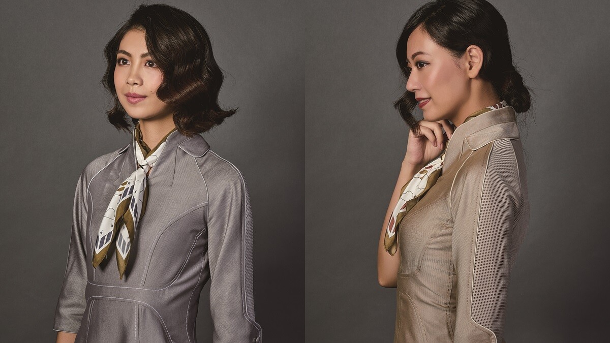 女性空服員、座艙長制服用顏色區分職級,呼應客艙的大地色系,金銀色洋裝呈現未來科技感,在背部及袖子更有透氣網布拼接設計,強化舒適及功能性。七分袖則能看到以飛機稜線的靈感設計,配上微立領、絲巾,流露婉約氣質。冬天時還會換上古斗篷式大衣,變身復古巴黎名伶。