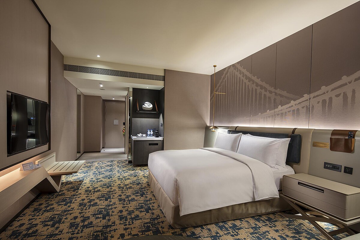台北新板希爾頓酒店共有400間客房,包括「希爾頓客房」、「行政客房」、「愛心客房」、「豪華套房」及全台唯一擁有4個臥房配置的「總統套房」,室內設計也融合了小巧思,床頭牆面上的橋樑圖案象徵旅人在不同國家及城市間的連結!