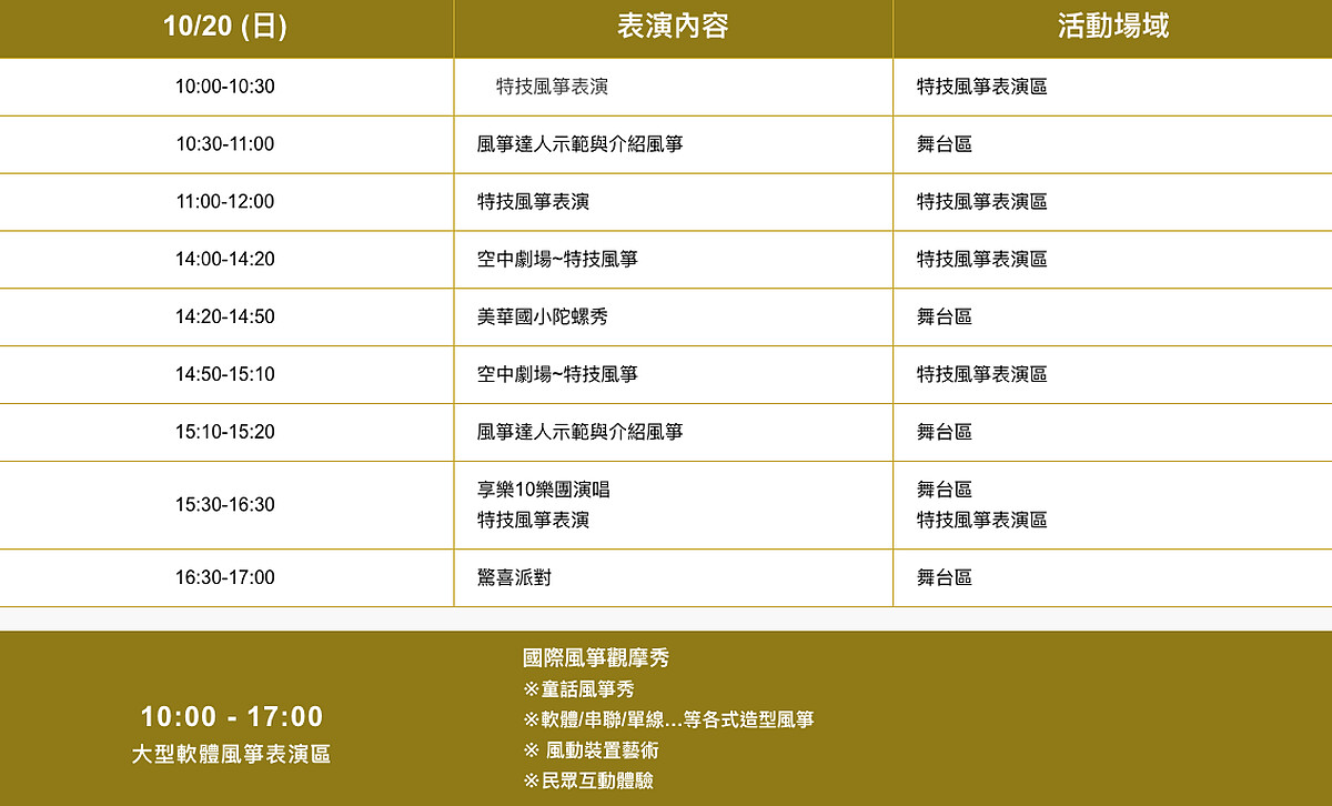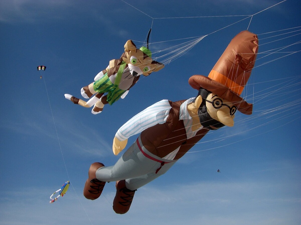 大家最關心的造型風箏,包含了阿拉丁與神燈、龍貓公車、江南大叔、台灣石虎,還有來自國童話電視劇「藍灰狼與書呆子蜥蜴」、法國風箏藝術家Francis Paragon夫妻檔創作的「動物園」,能看到6米高長頸鹿、大象、鴕鳥等,另外也有白鴿、毛毛蟲、瓢蟲等地景風箏,絕對會喚起童年時的樂趣與幸福。