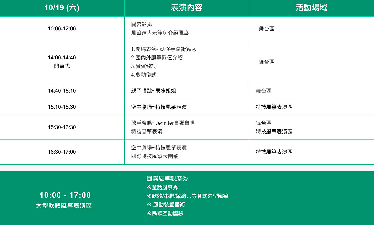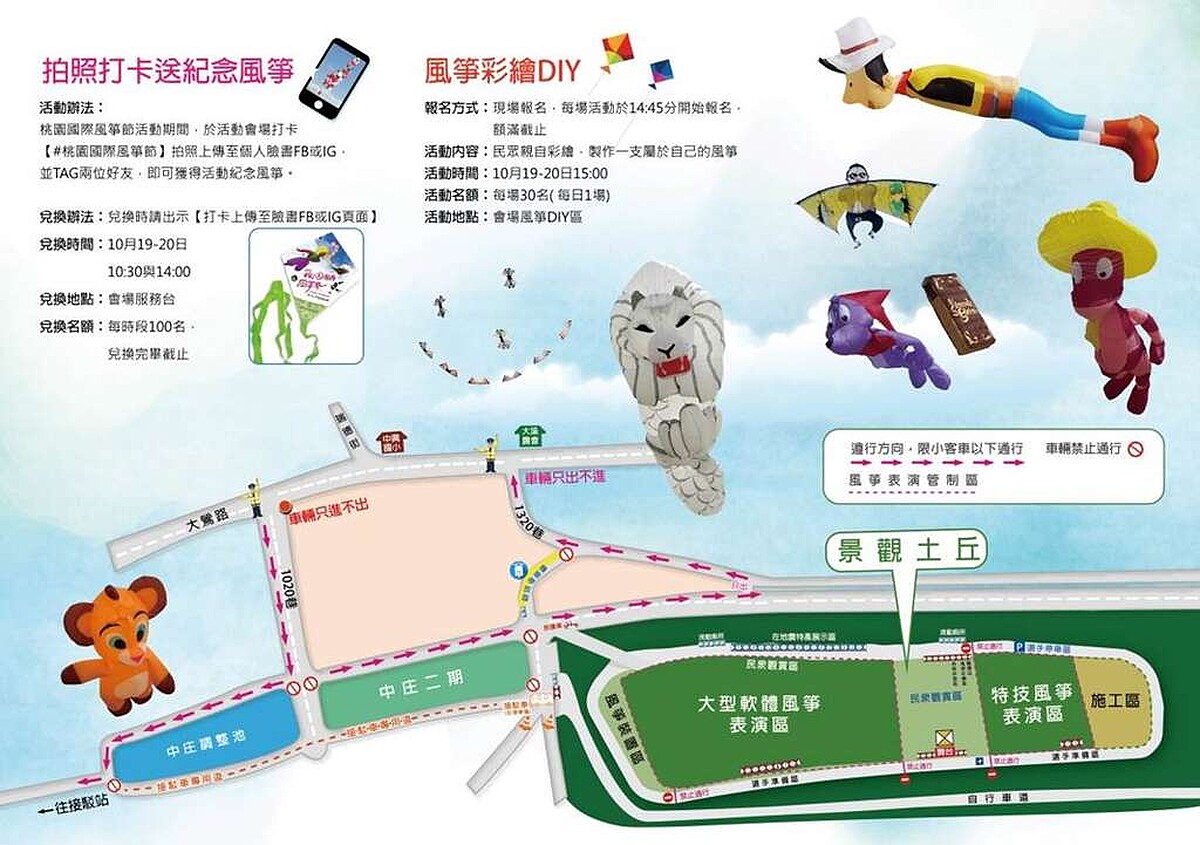 這次還首創風箏空中劇場,能看到風箏們上演史艷文戰藏鏡人、西遊記、客家採茶大戲、惡魔精靈、江南大叔等精彩戲碼,結合中庄景觀土丘景觀池、大草坪、景觀平台、自行車道等水文景觀,是絕佳的週末好去處。