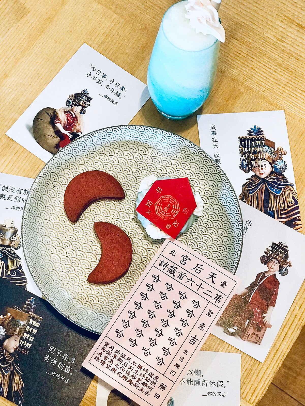 在天后休假中獨創「天后休假文房四寶」結合了天后休假金句,「天后箴言箋」便條紙、「玉不琢,不成器 ; 人不休,不可以」象徵墨水的削鉛筆器、「你和圓滿之間,只有一筆假單的距離」象徵毛筆的鉛筆、以及「擦去行事曆,一秒斷捨離」暗喻硯台的黑色橡皮擦,讓大家苦悶的上班日常也能會心一笑勇敢休假,