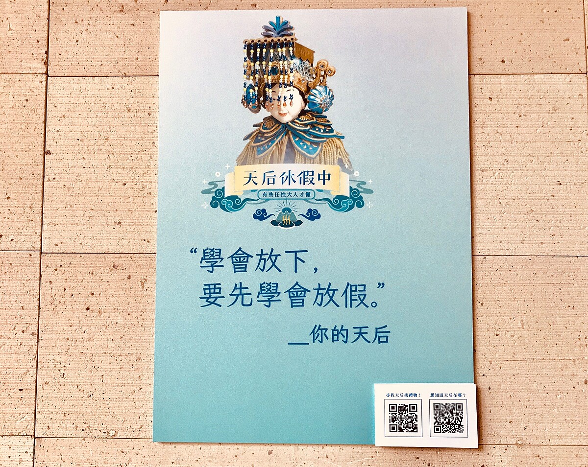 礁溪老爺特別擲筊請到神級代言人「浩天宮媽祖娘娘」一同加入休假行列,還特地創造出一尊「休假天后」出巡度假,「連媽祖都來礁溪老爺休假了,你還在這做什麼?」。