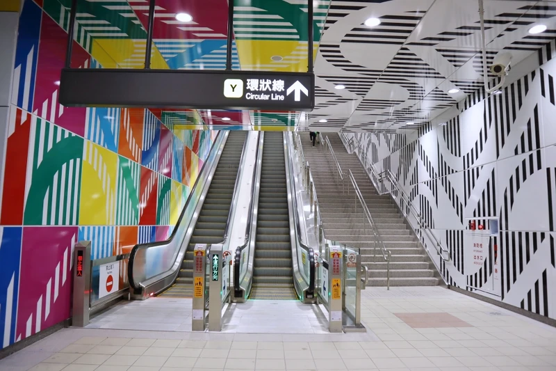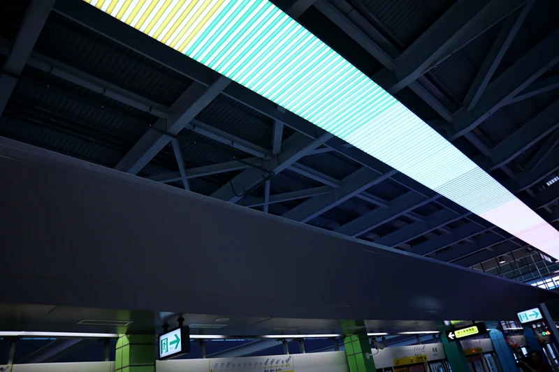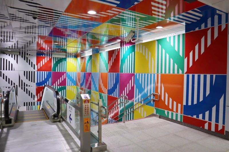 而延著天花板、樓梯壁面到月台大廳及12根墩柱,也用上8種黑白、彩色等高明度、高彩度色調,以及配合晨昏、列車進站的LED燈光變化,為車站增添流動感,也讓旅客彷彿置身於時光流影之中,想必能排解通勤時的焦慮。這件繽紛的大型藝術,相信在通車後會成為全新打卡景點,值得花時間好好去感受一下。