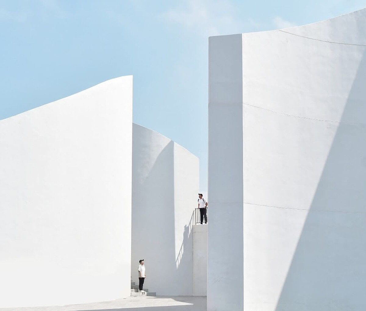 彰化最新打卡景點,園區主建築以純白為主,彎曲牆面的設計讓建築物格外有特色,不同角度看上去都有不同特色,加上太陽光影變化,造就豐富的光影層次,旁邊還有風車真的超好拍。