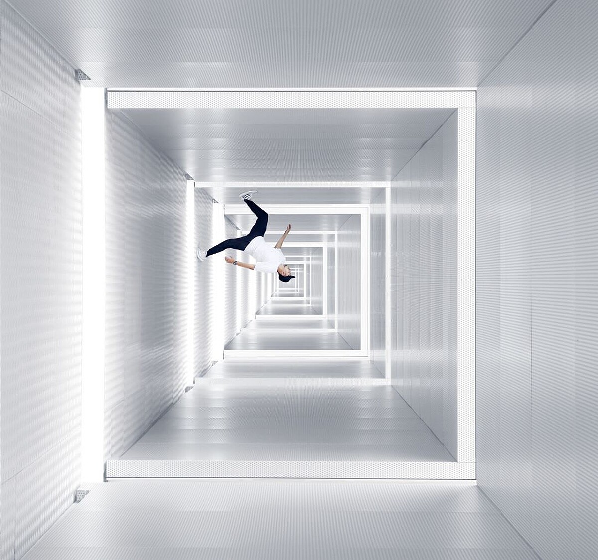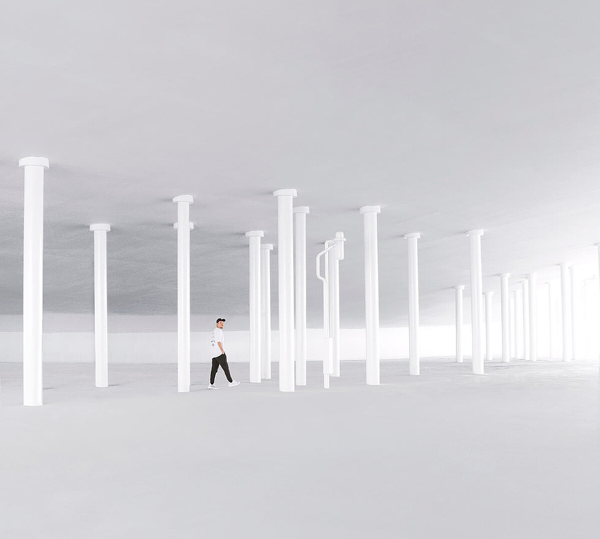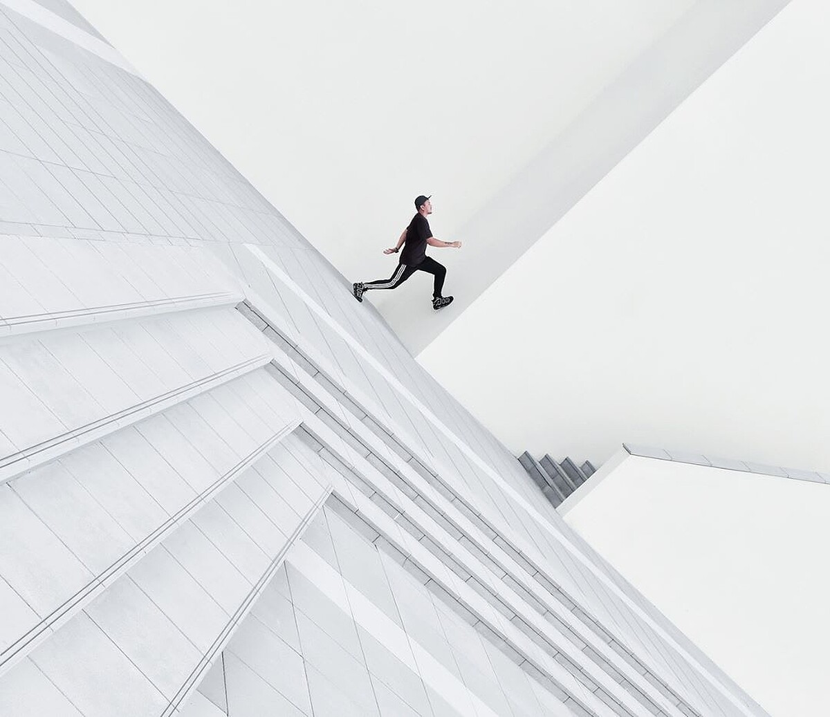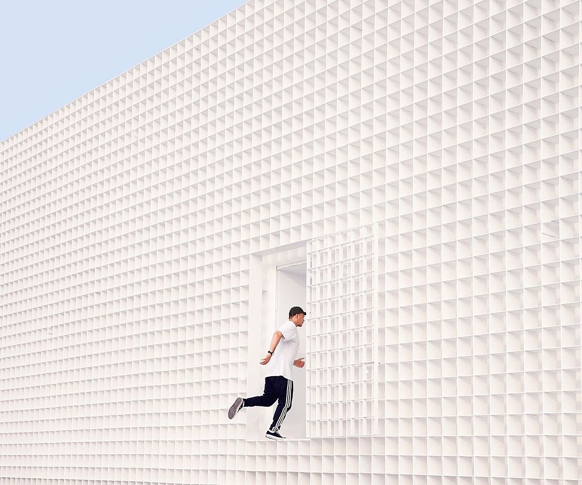 小秘訣:構圖方式可將主角置於畫面的中間,動作可以是自然地行走或是奔跑起來,服裝可以搭配黑色的,讓你在純白的畫面中成為亮點。