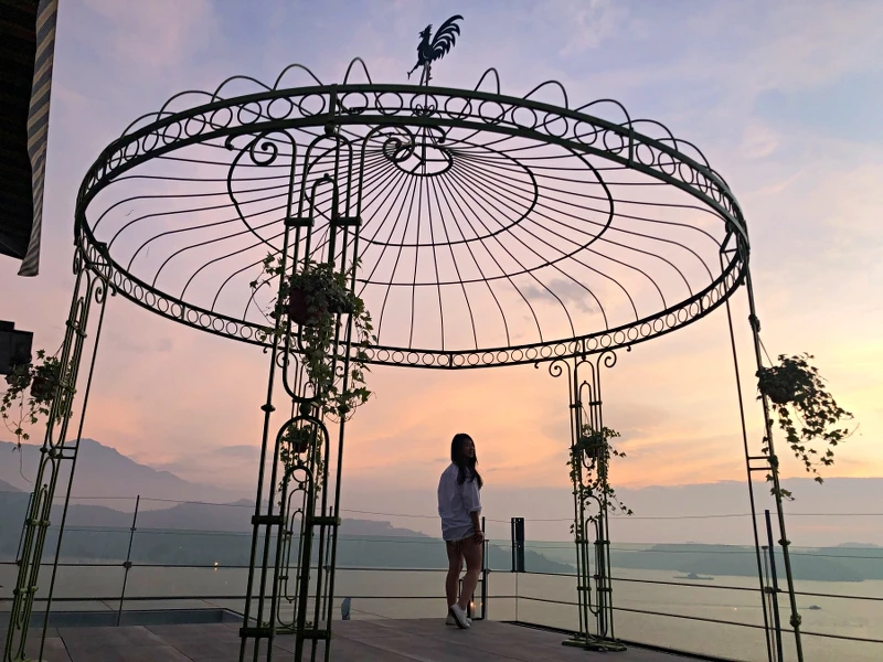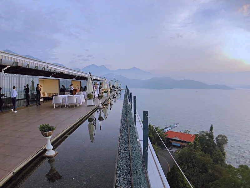 身為日月潭第一間溫泉酒店,雲品酒店全館都以落地窗引進天然美景,除此之外,一定要踏上頂樓的Sky Lounge雲月舫,把日月潭270度的湖光山色盡收眼底。大推黃昏時期,能觀賞黃色到紫色漸變的夕陽,勢必成為旅程中最美畫面之一。記得來一杯埔里百香果、南投梅子酒、紅玉紅茶製成的「山明水秀」,視覺、味覺都品嚐得到日月潭之美。