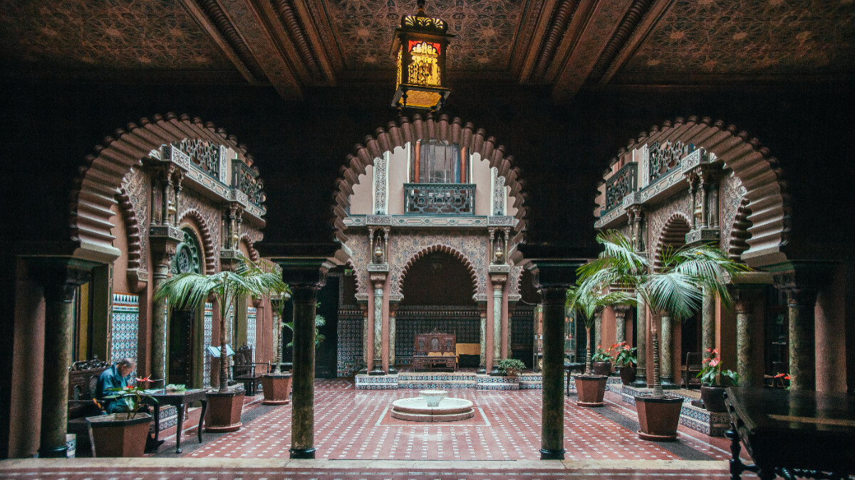 「Casa do Alentejo」是棟十七世紀後期的摩爾式建築,一樓以迴廊和連續的馬蹄形拱門環繞,牆面鋪滿釉色鮮豔的瓷磚,陽光透過玻璃天井,映出神祕靜謐的光感。拾階走上二樓,路易十六風格的宴會廳,盡是古典雅緻的壁畫和雕飾,水晶吊燈浮誇在空中高掛。
