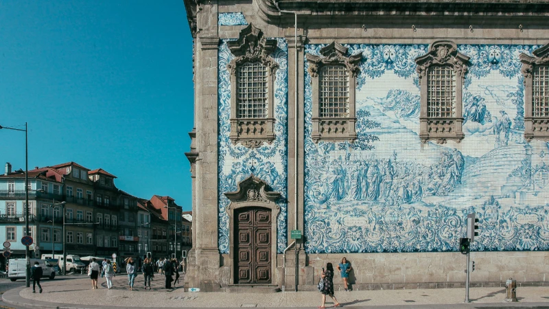 名為「Azulejo」的花磚是出自摩爾人的藝術,於十五世紀引入葡萄牙。經典的藍白瓷早期用於教堂、修道院、宮殿或貴族宅邸,如同一幅幅畫卷,描繪著宗教信仰、市井生活和大航海時代的輝煌。由於1755年里斯本大地震使城市大崩毀,因此在波多能欣賞到規模更大的藍瓷壁畫,像是一踏進「聖本篤車站」大廳,便由兩萬片藍白瓷環繞,如同歷史縮影,晨光映入時更覺夢幻迷人。「卡爾莫教堂」高大的外牆上則以細膩筆法勾勒出天主教隱修會創立的景象,堪稱是波多最美的打卡牆。