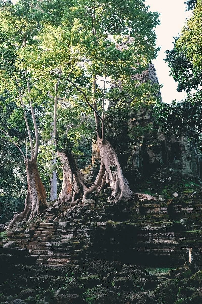 除了吳哥窟,闍耶跋摩七世為母親建造的塔普倫寺(Ta Phrom)尤其是極為浪漫的景點。建於12世紀,被無花果樹和絲棉樹等參天古樹包圍的斷垣殘壁,被《古墓奇兵》選為拍攝地點再適合也不過。這些矗立百年以上的石塊長出綠意昂然的青苔,寺廟本身更與老樹相生共存,盤結糾纏的樹根長出了天然的歲月感。寺廟中心的屋子更是闍耶跋摩七世為母親建造的宇宙屋,原本鑲嵌在牆上的各色寶石,是要讓母親見到銀河的浩瀚,但百年過去。那些價值連城的彩寶早已被盜墓者取走,只剩下空蕩的壁洞。在這裡,剛與柔構築的氣場,互為觀照,古老且浪漫。