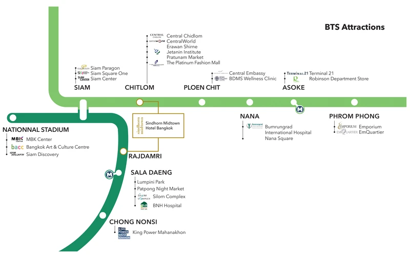 從地理位置看起,由Siam Sindhorn公司建設的Sindhorn Midtown飯店,距離BTS奇隆站Chit Lom、拉差當梅站Ratchadamri都只需步行5分鐘,到水門市場、四面佛也是差不多的時間,交通相當便捷,也能輕鬆走到最大百貨城Central World、暹羅百麗宮百貨Siam Paragon、暹邏潮流中心Siam Center。